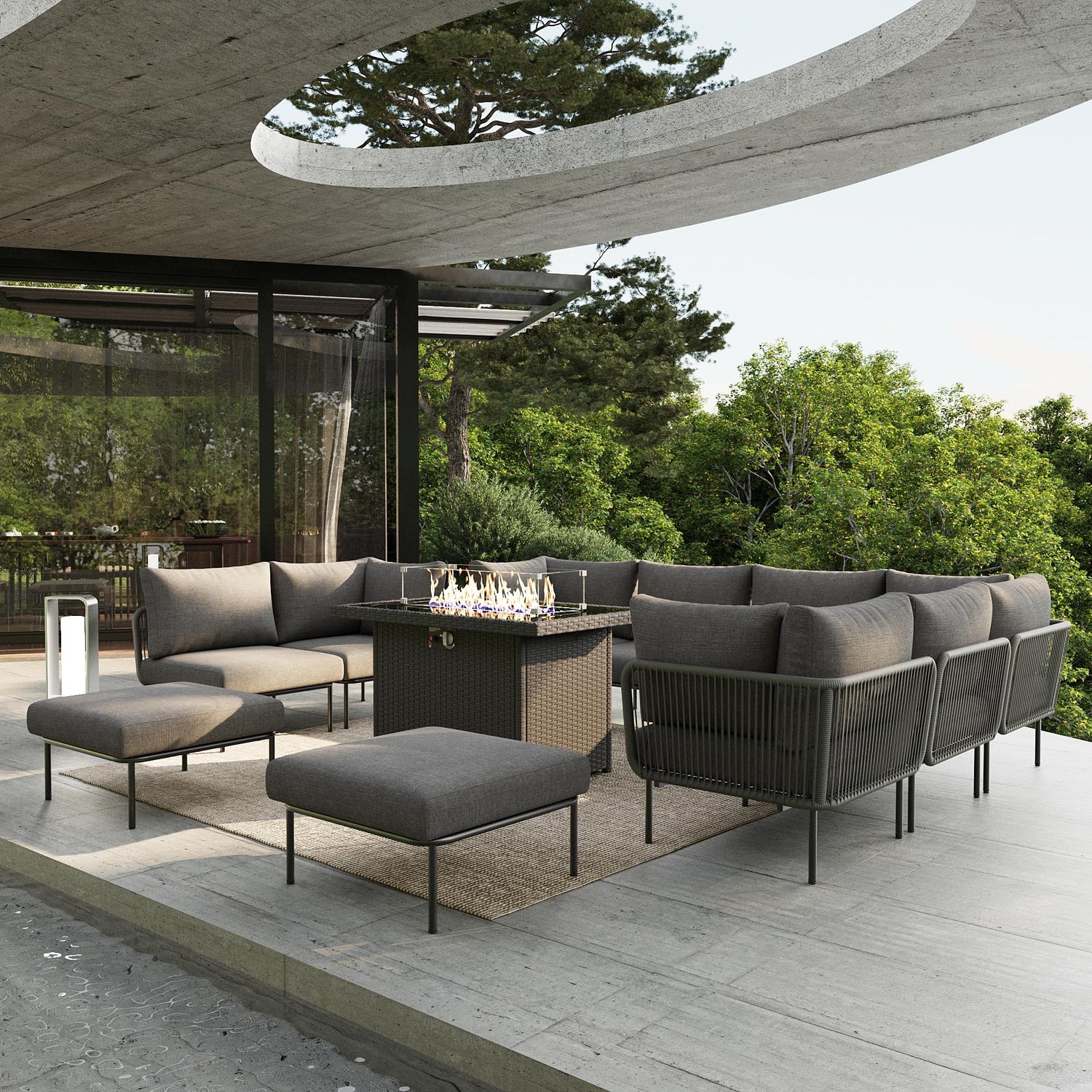 Vakollia 11 Piece Modern Outdoor Rope Wicker Sectional Patio L-Shaped Conversation Sofa Set Deep Seating with Fire Pit Table