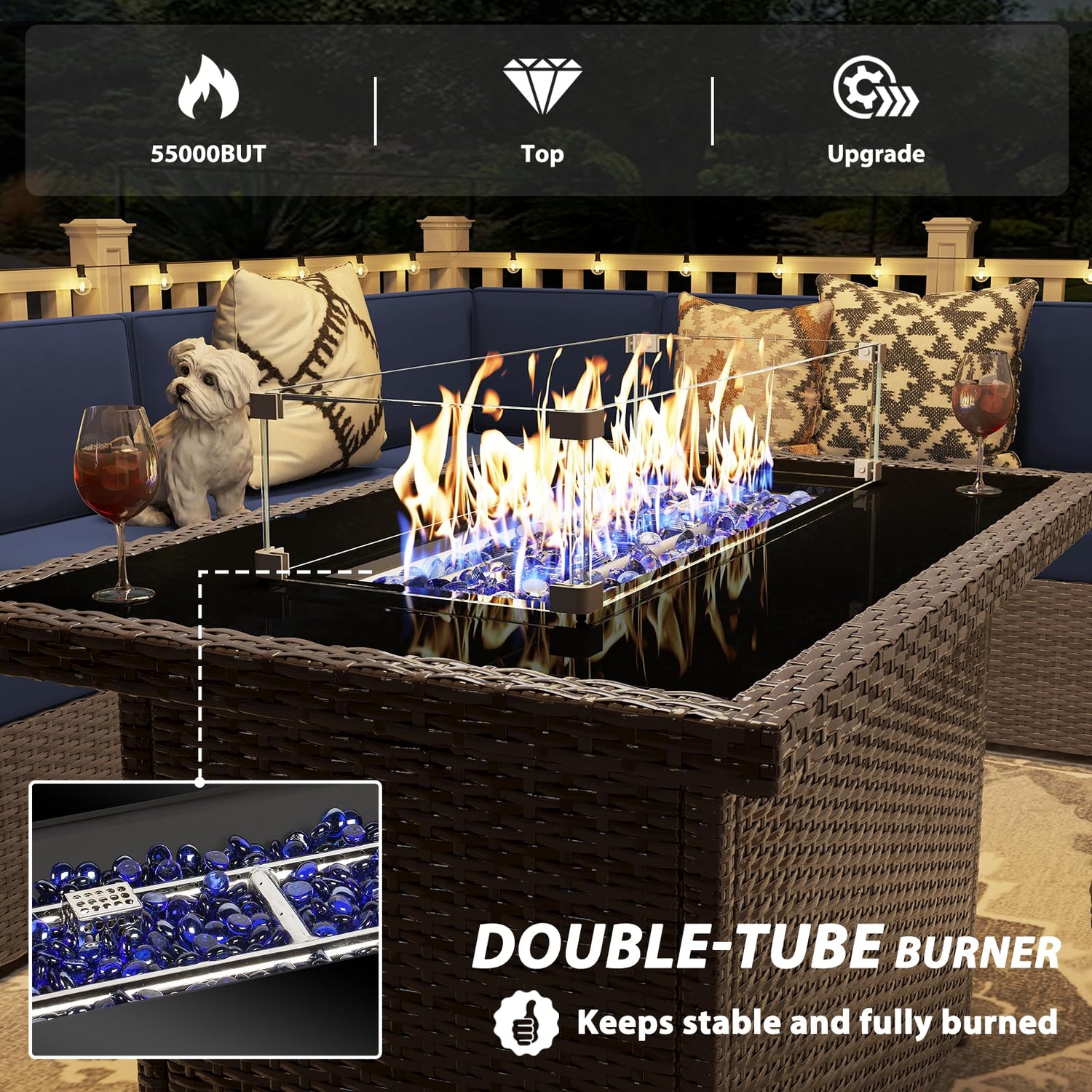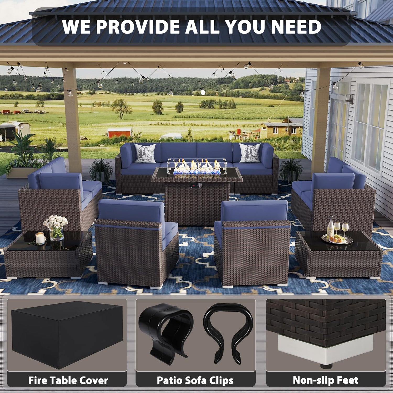 Vakollia 13 Pieces Patio Furniture Set with 44" Propane Gas Fire Pit Table, Outdoor Sectional Wicker Conversation Sofa Sets with Coffee Table
