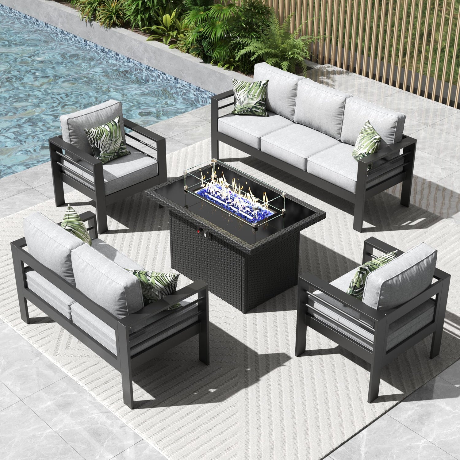Vakollia 5 Pieces Modern Aluminum Patio Furniture Set with Fire Pit Table, Outdoor Conversation Sets Metal Sectional Sofa