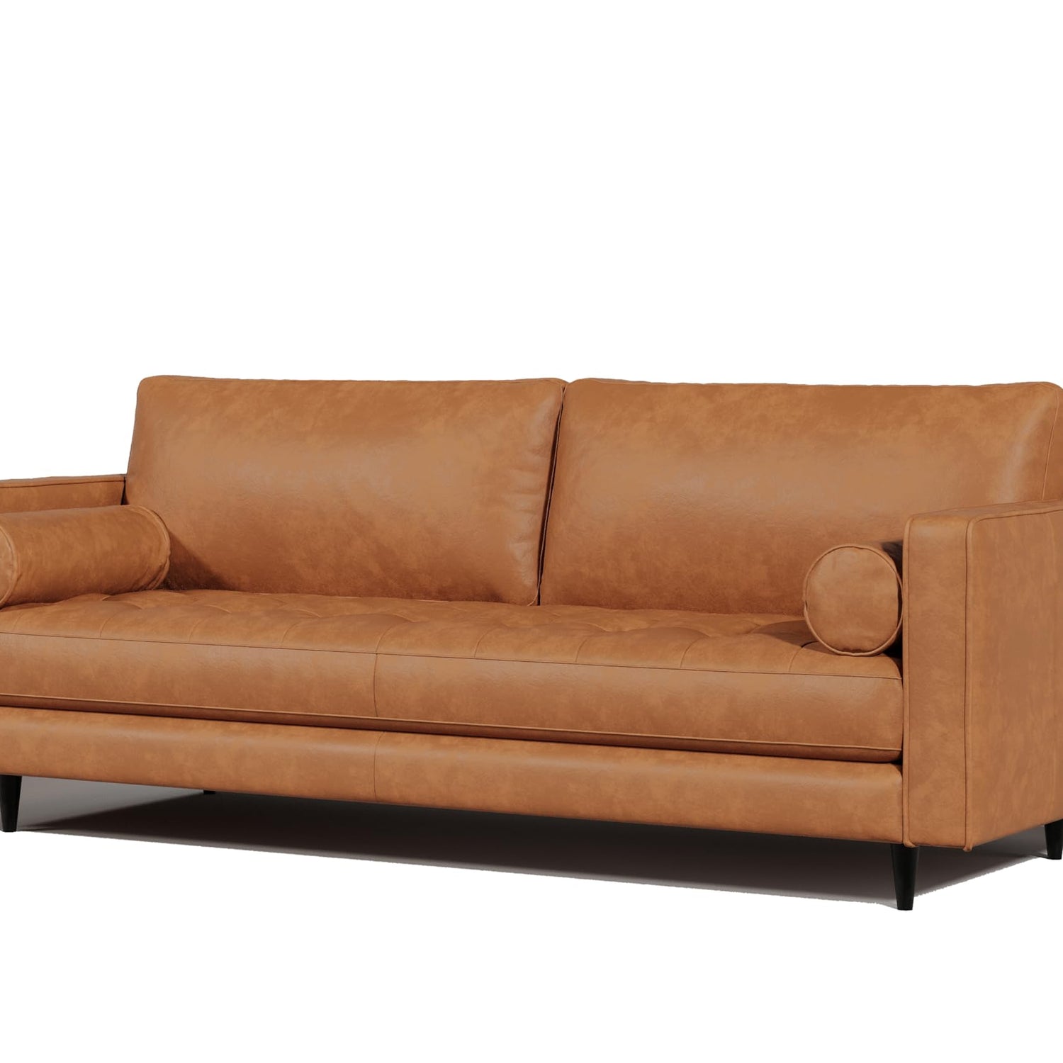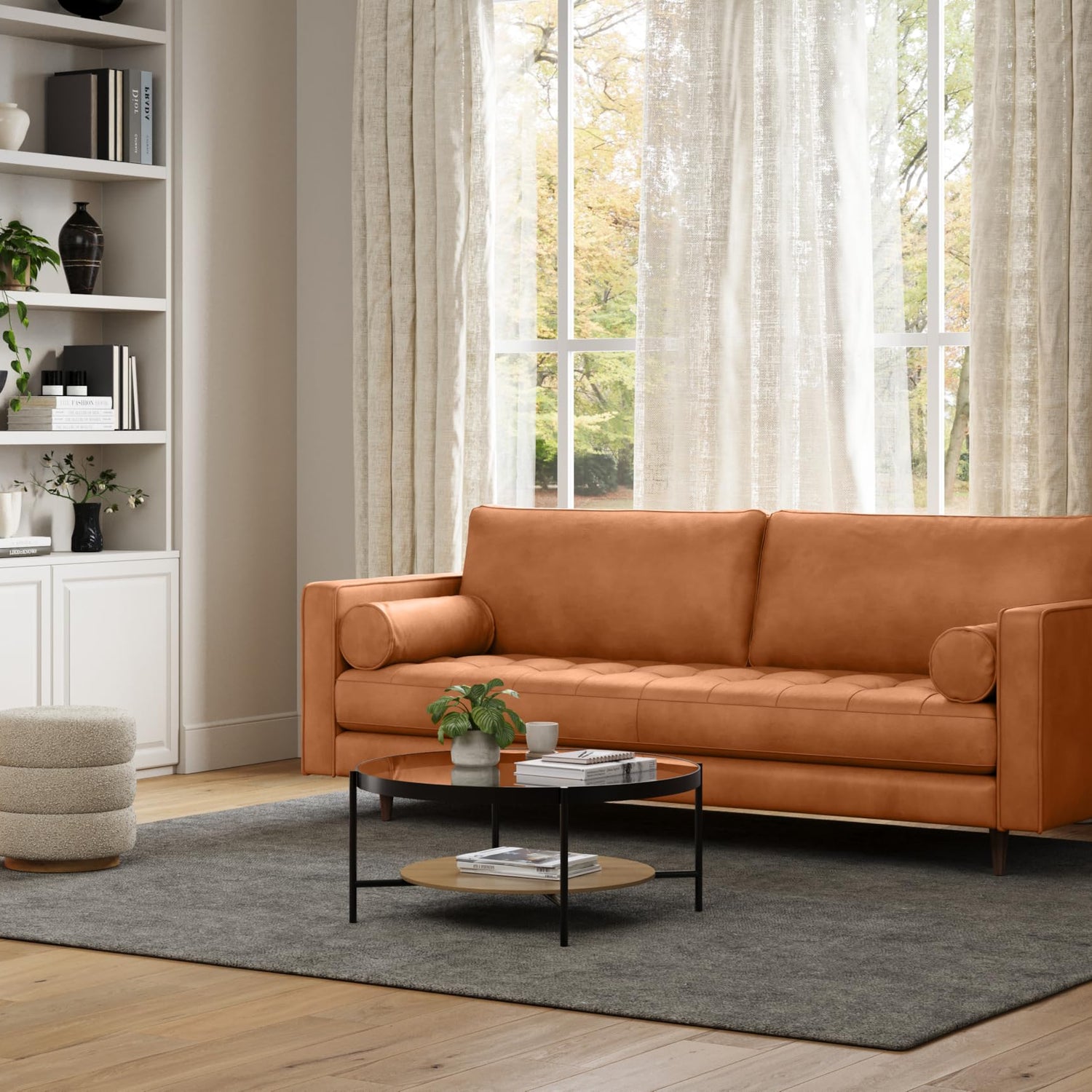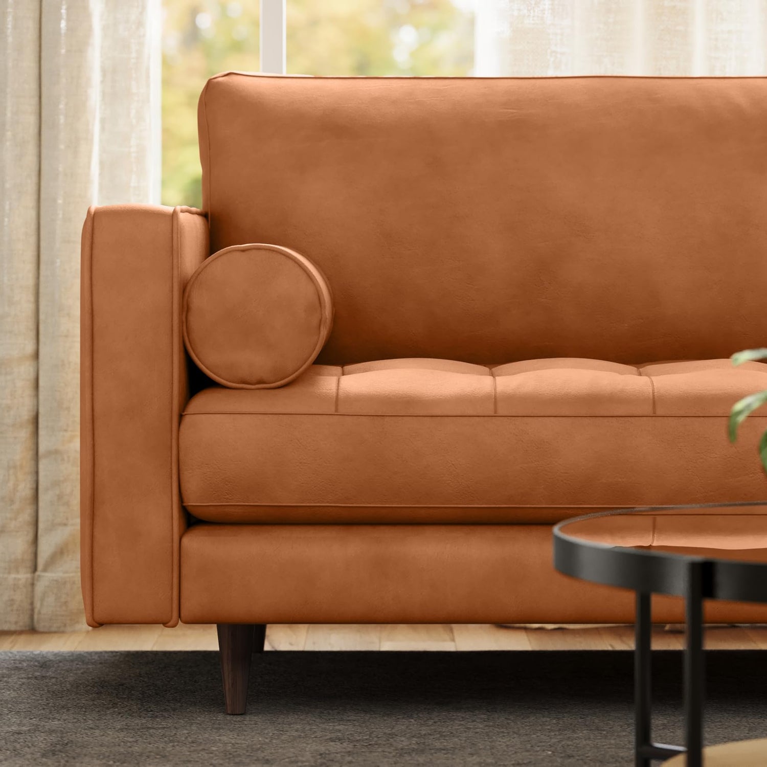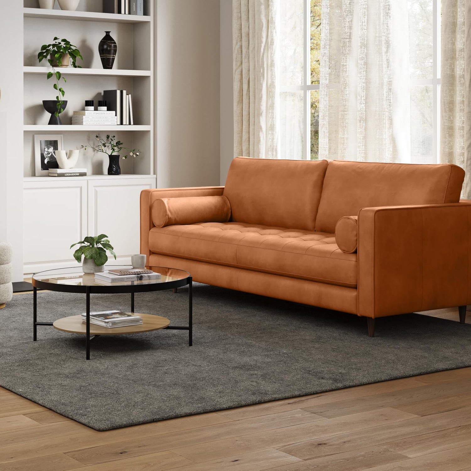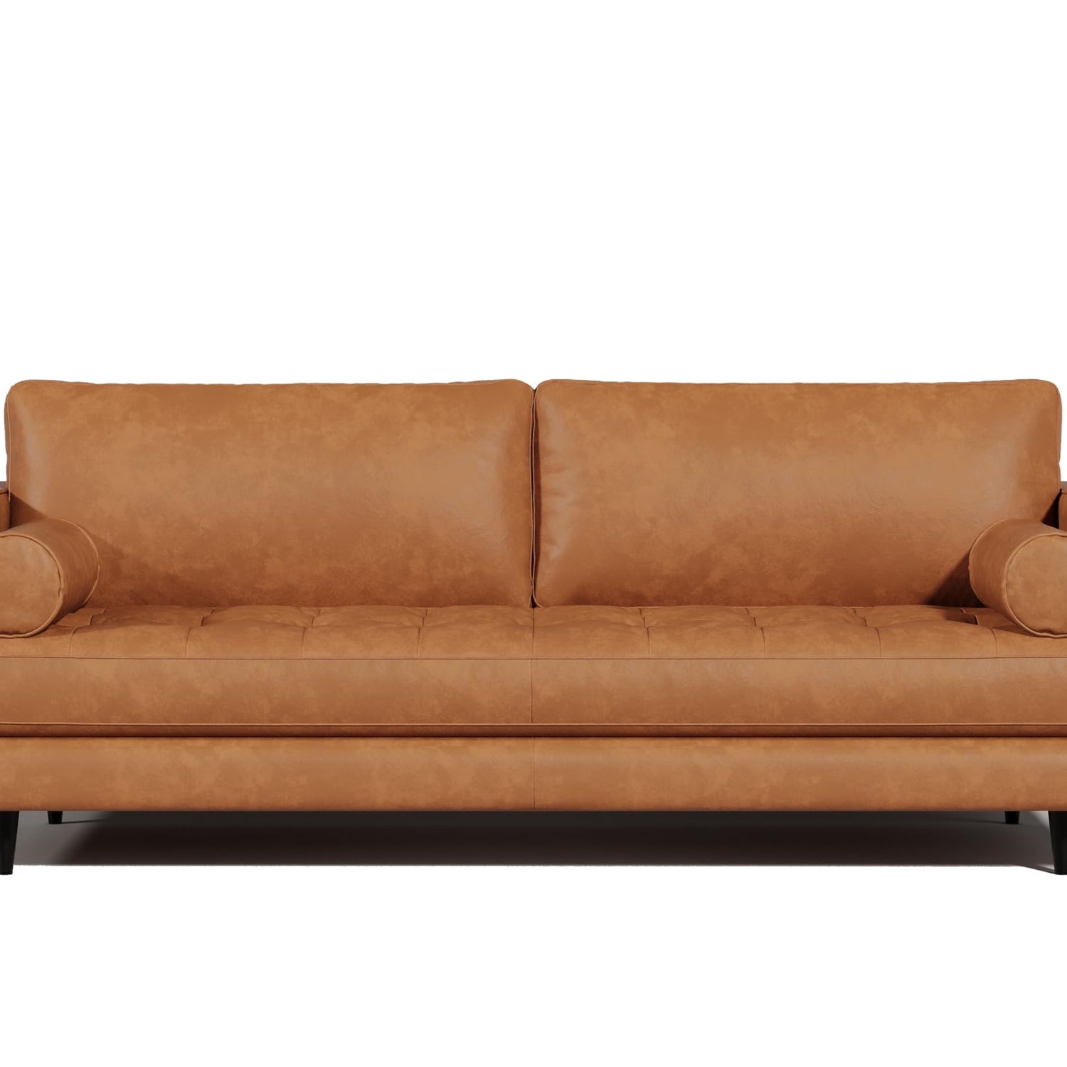 Valencia Isabella 88" Wide Sofa with 2 Bolsters | Italian Nappa 11000 Full Grain Leather, Mid-Century Tufted Couch for Living Room, Kiln-Dried Wood Frame, Down Feather Filling, Cognac