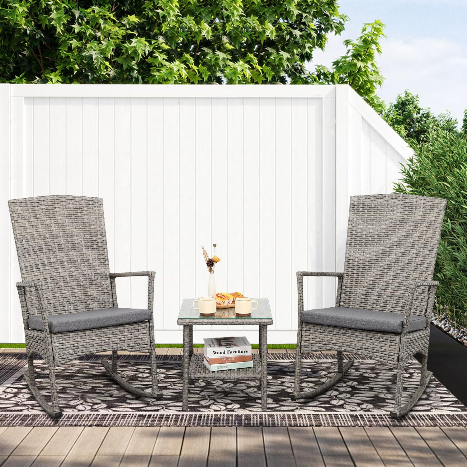Valita 3 Piece Patio Rocking Chair Outdoor Rattan Bistro Set with Glass Top Table Conversation Set with Grey PE Wicker, Gray Cushion