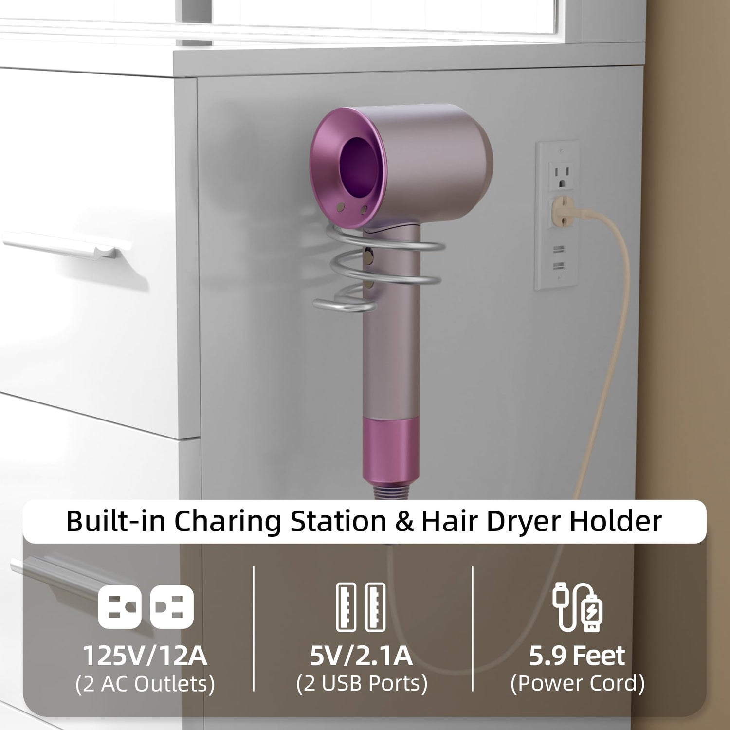 - 【Makeup Table with Charging Station】 Equipped with a charging station, this vanity desk includes 2 standard outlets and 2 USB ports, making it easy to connect devices like hair dryers or charge phones and tablets—ideal for your dressing room, bedroom, salon, or live broadcasts.