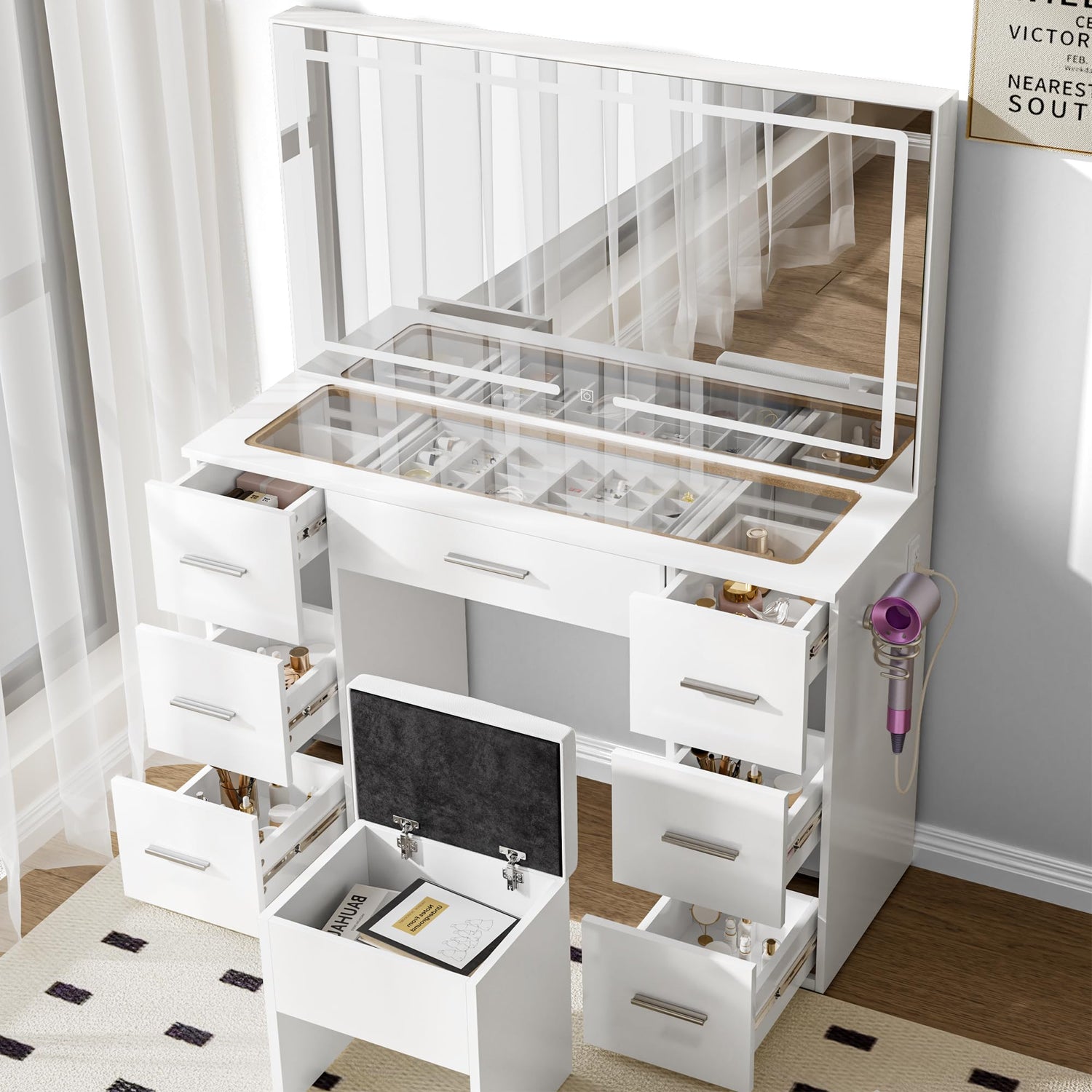 - 【7-Drawer 46" Vanity Table】 Our vanity features 7 drawers, providing generous storage for your makeup and hair tools. Keep your cosmetics and jewelry neatly organized in the various drawers and shelving options until you need them.