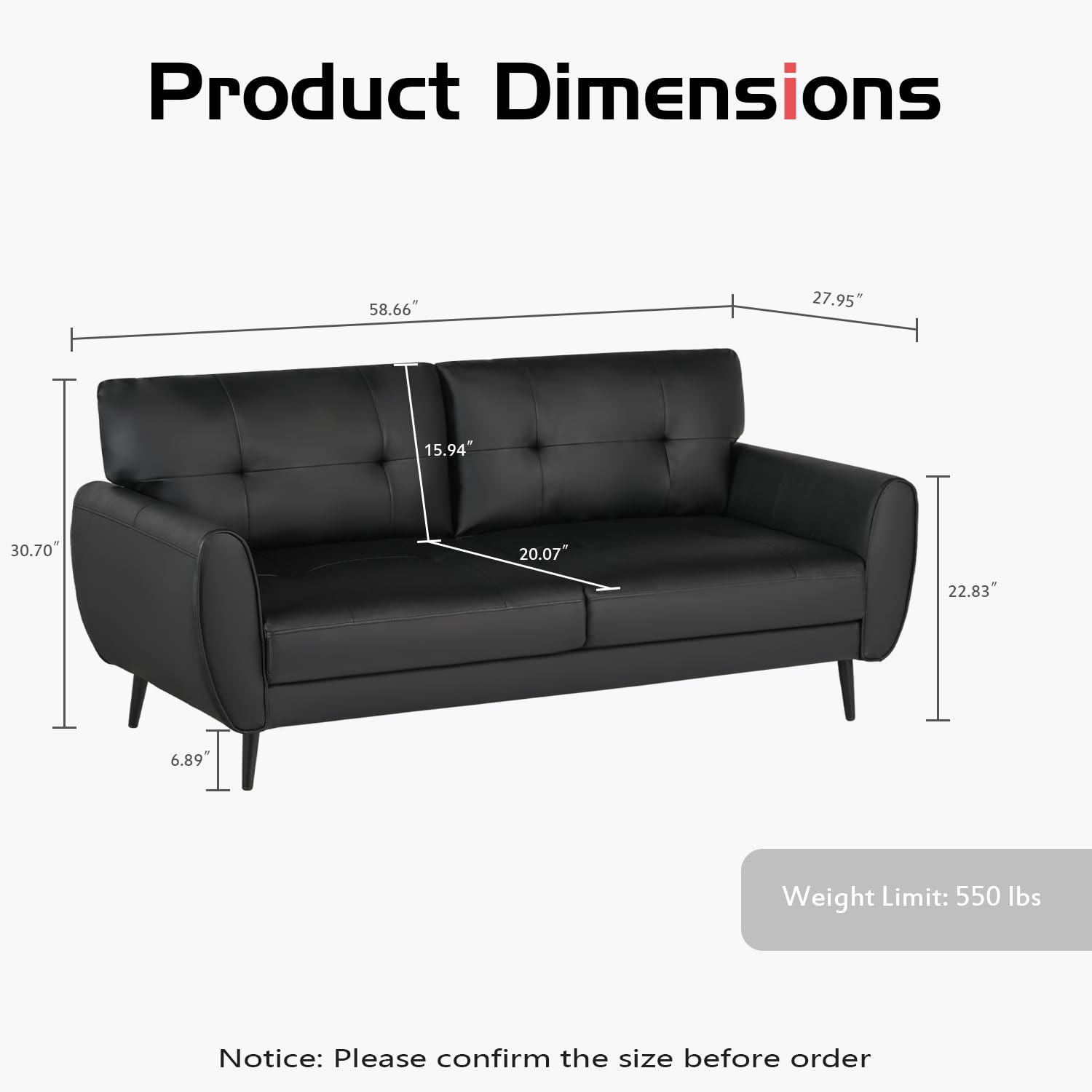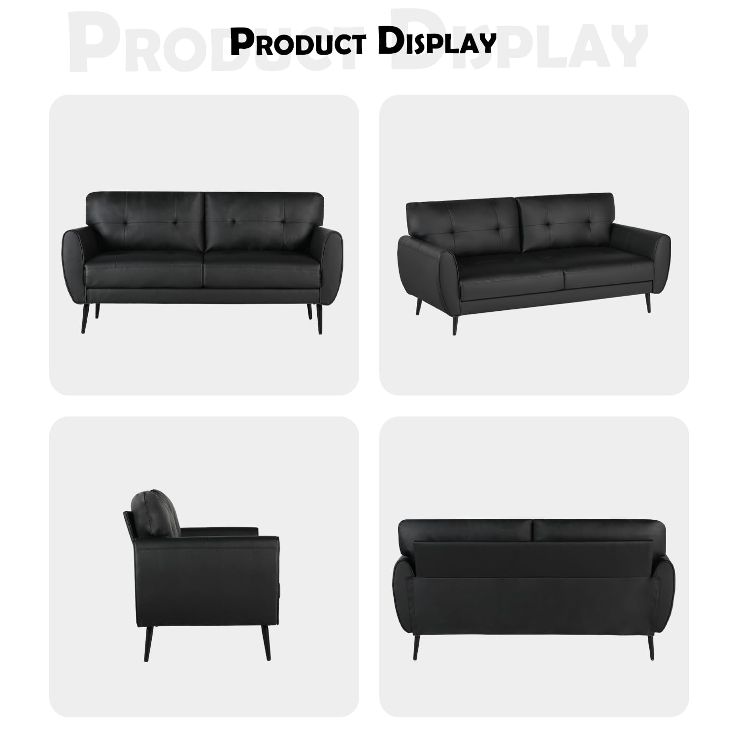 - 【Mid Century Modern Loveseat Sofa】This black loveseat sofa uses faux leather, smooth structure curve, solid color pattern, and uses stylish mid-century modern tufted stitching to outline exquisite furniture and bring a beautiful visual experience. The understated and luxurious solid black pattern can be matched with various styles of furniture whether it is bedroom, living room, study, vanity room, office, nursery, conference room, and other places. Dimensions:60.63"(L) x 27.95"(W) x 30.70"(H)