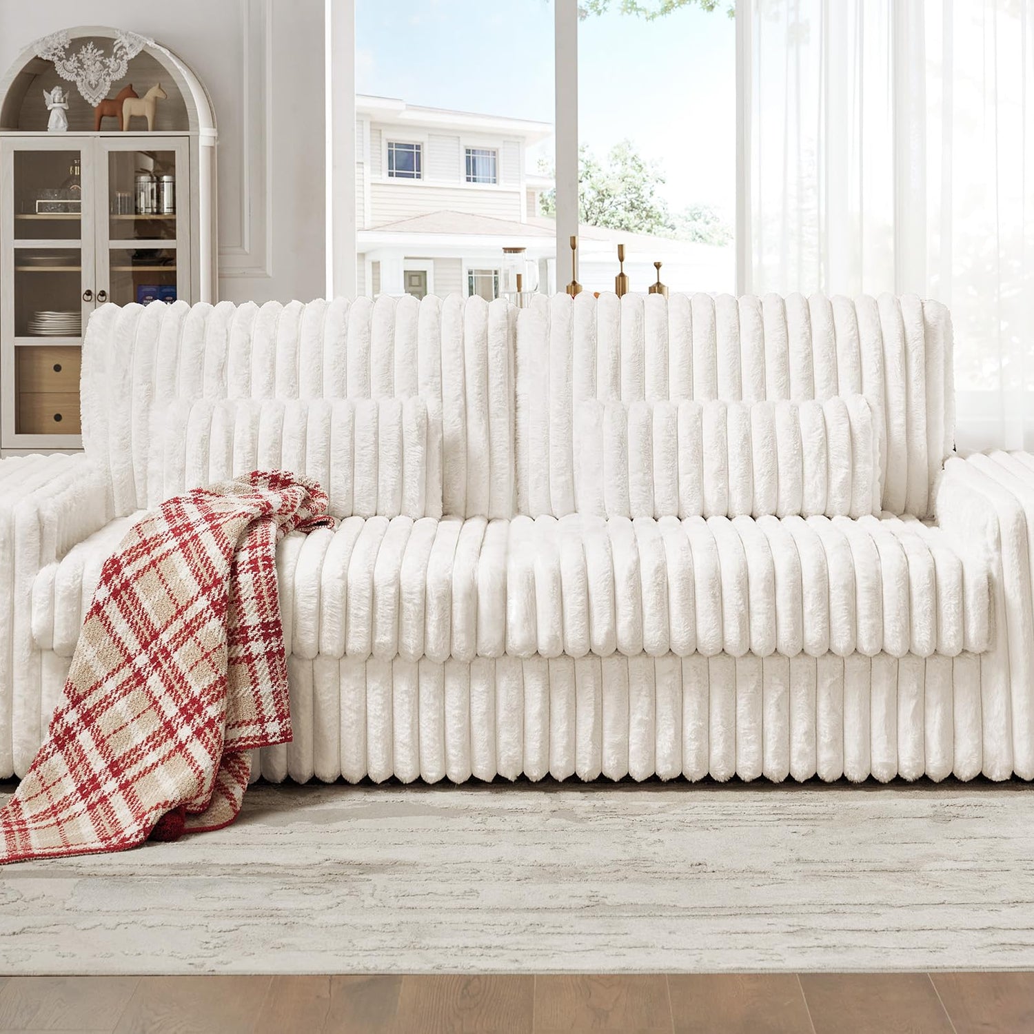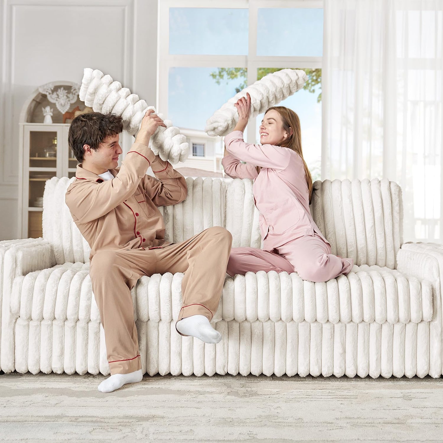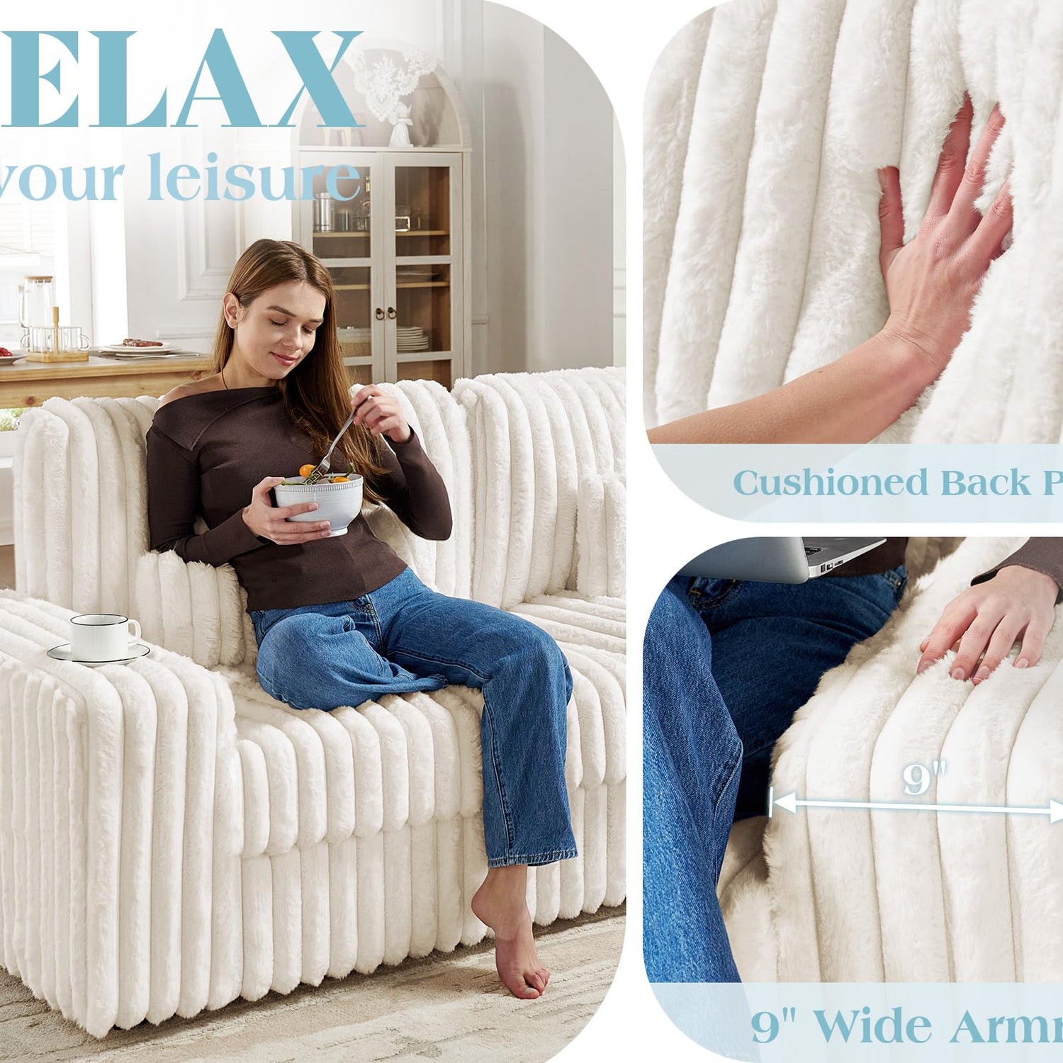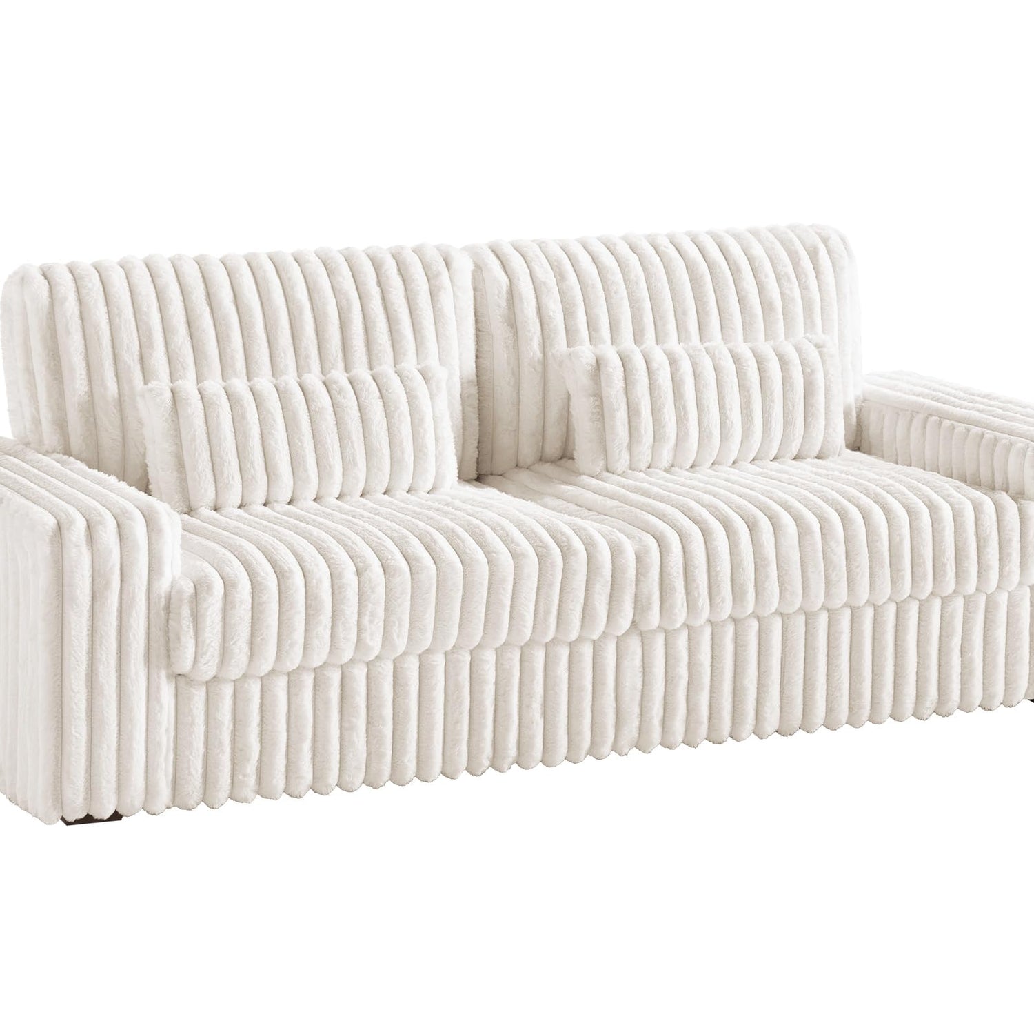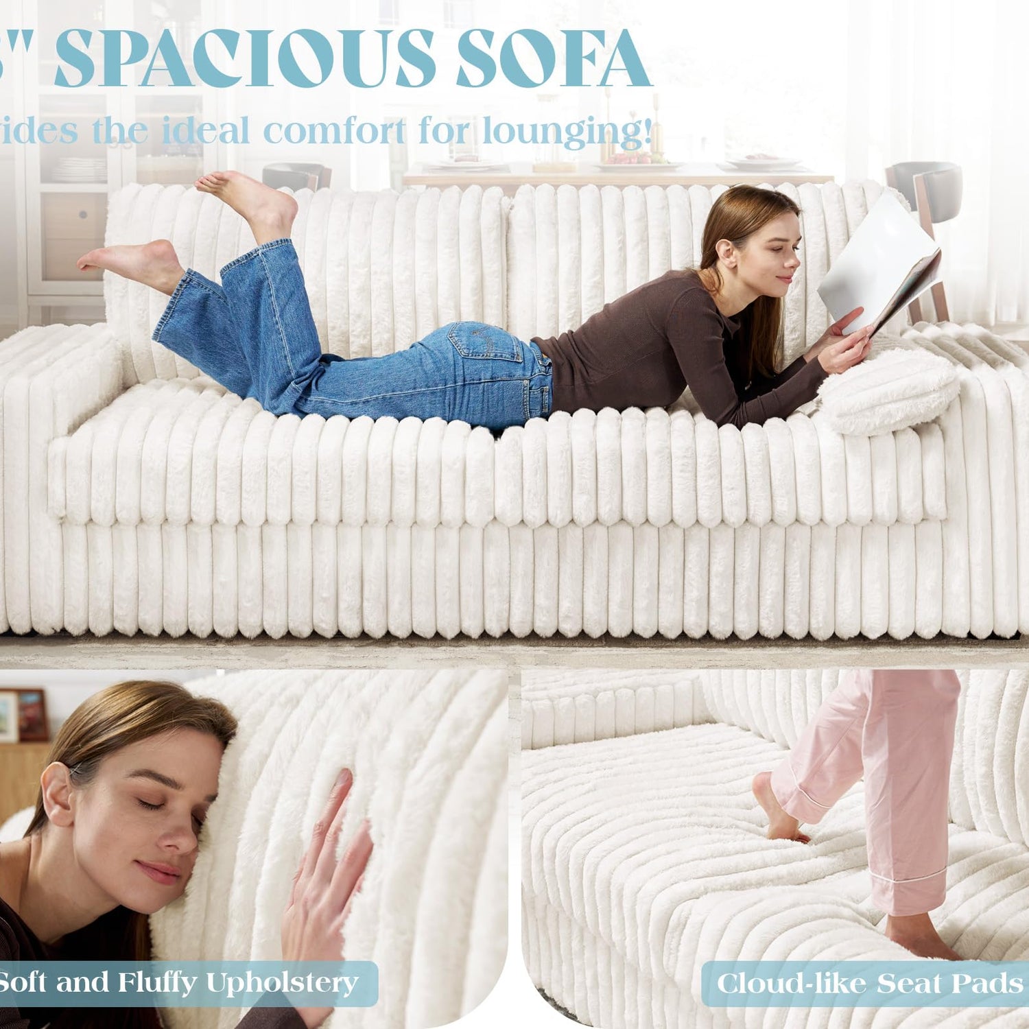 - Plush& Texture: Wrapped in striped faux fur fabric, this cloud couch delivers a delightful texture. The soft, plush feel invites you to relax in its cozy embrace.