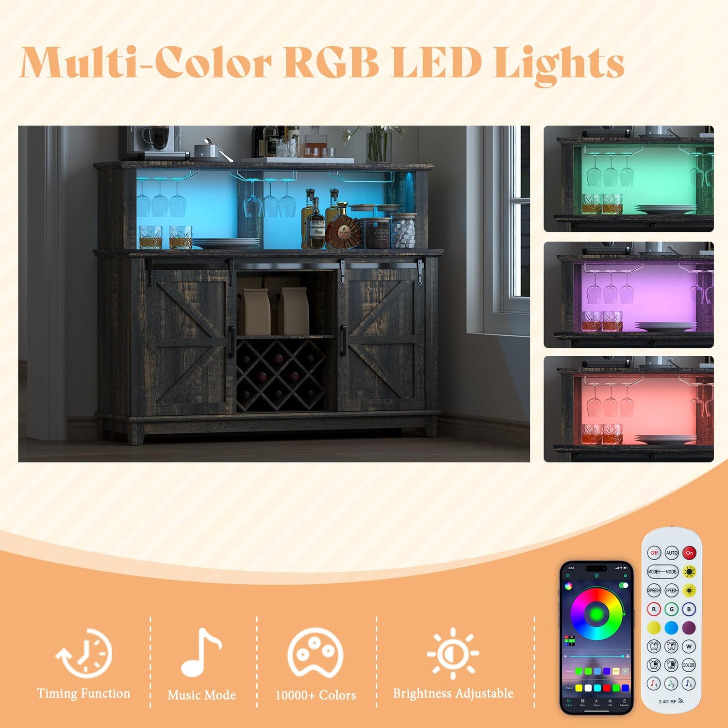- Bar Cabinet with LED Lights: The built-in LED strip offers multiple colors to elevate your drinking or dining experience. Customize the lighting with Bluetooth or button controls for an ideal ambiance.