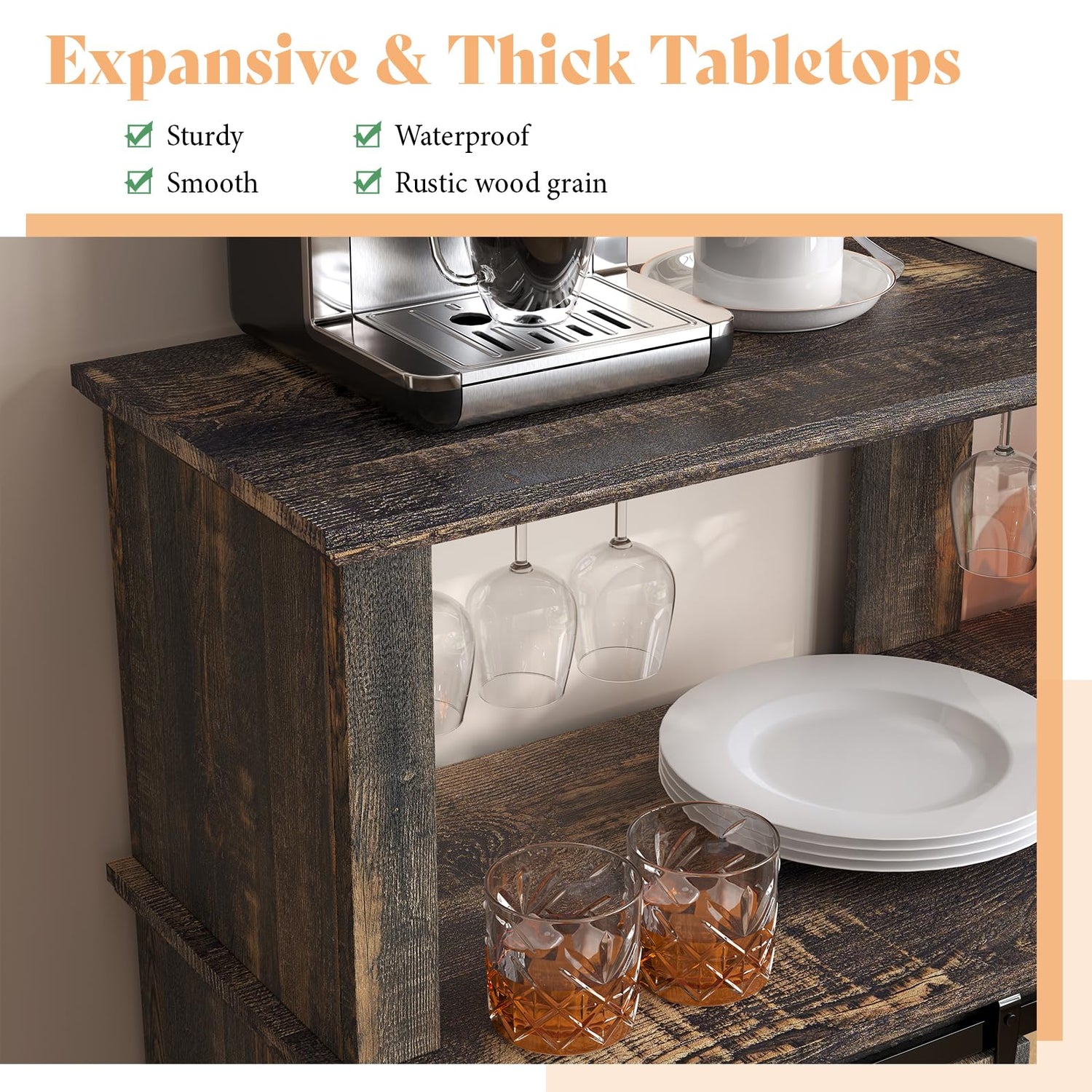 - Simple Assembly: Measuring 55.1"W x 15.7"D x 44.7"H, this Farmhouse Coffee Bar Cabinet has more storage space than traditional coffee bar cabinets. The cabinet comes with clear instructions and labeled parts for quick and easy assembly.