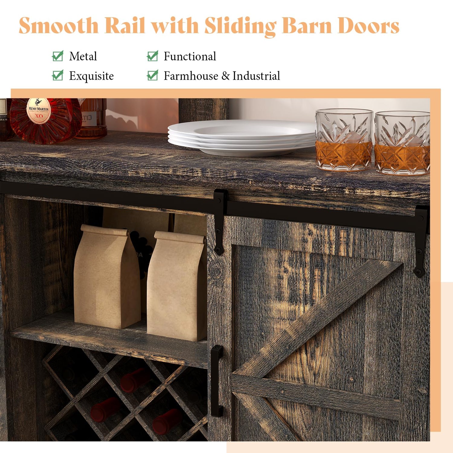 - Timeless & Stylish Design: This bar cabinet features a farmhouse-inspired look with sliding barn doors and a wood grain finish, adding rustic charm to your dining or living room. The sliding doors provide flexible storage options, allowing you to arrange items either centrally or on the sides.