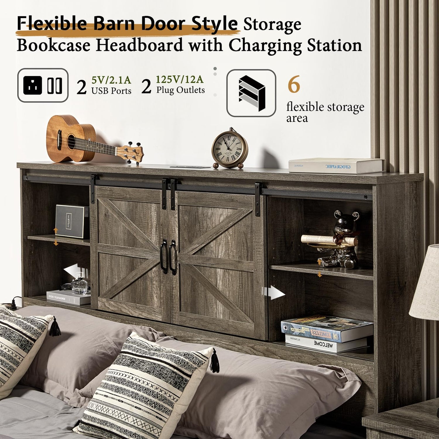 The rustic grey finish adds a tranquil touch to your space, perfectly complemented by the bookcase headboard inspired by classic barn doors. This headboard is not only a stylish feature but also comes equipped with six generous compartments, allowing you to display books, photos, or other personal treasures. The two adjustable shelves provide flexible storage options to suit your needs.