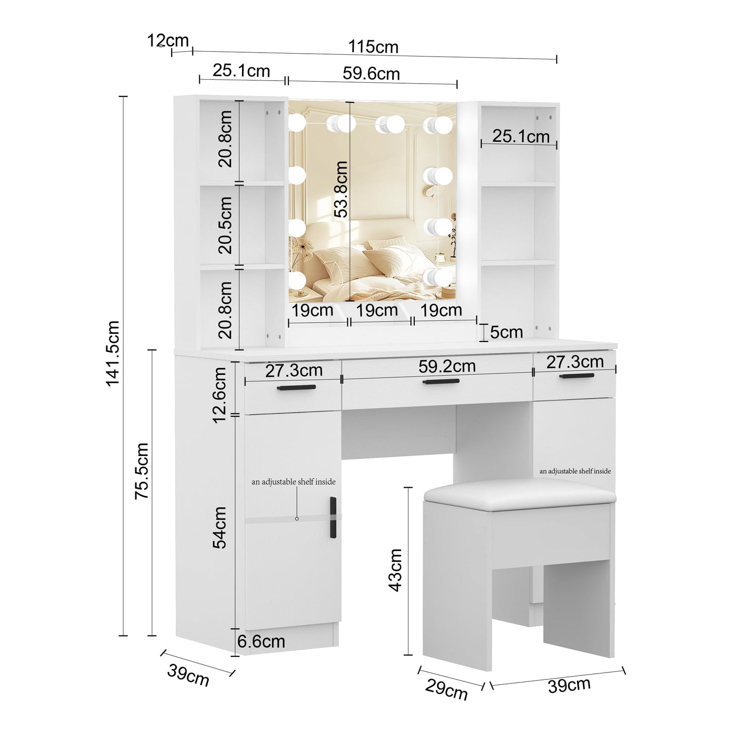 Vanity Desk, Makeup Table with Lights Vanity Set with 3 Drawers, 1 Cabinet & 6 Shelves 3 Lighting Modes Brightness Adjustable Dressing Table with Cushioned Stool for Bedroom, Dressing Room (White)
