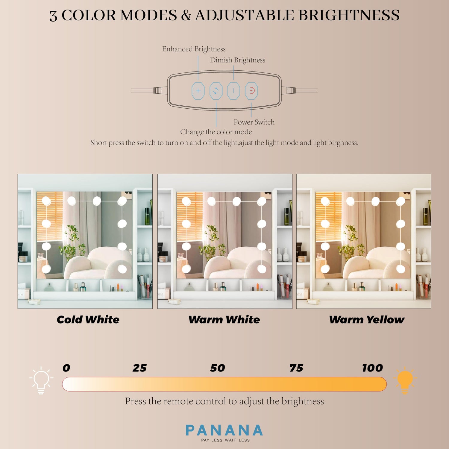 - Illuminated Mirror: The large mirror is surrounded by 10 Hollywood-style bulbs that offer 3 adjustable lighting modes (warm white, natural light, and cool white). Each mode's brightness can be customized to suit your preference, ensuring perfect lighting for any occasion