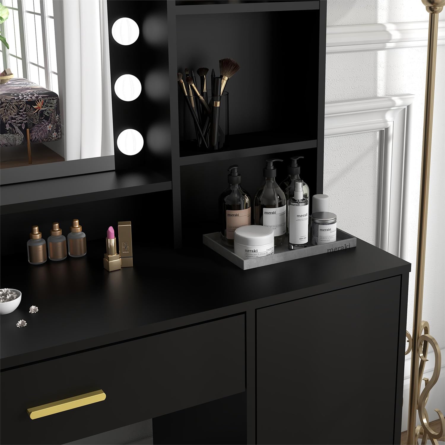 Vanity Desk, Vanity Mirror with Lights and Table Set with 1 Big Drawers, 1 Cabinet & 4 Shelves Makeup Vanity Set 3 Lighting Modes Brightness Adjustable Dressing Table (Black)
