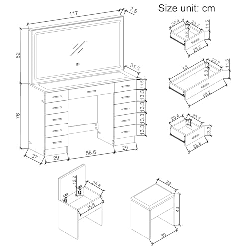 - Spacious Storage & Convenient Organization: This vanity boasts 11 spacious drawers for all your beauty essentials, keeping your space clutter-free. The included matching upholstered stool offers hidden storage, combining comfort and functionality.
