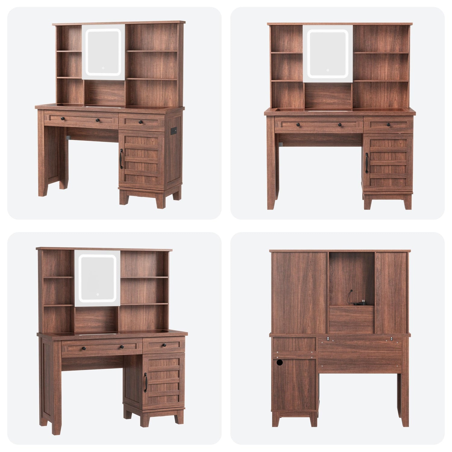 Vanity Desk with HD Mirror, LED Lights and Charging Station, Farmhouse Makeup Table with 2 Drawers and Cushioned Stool Dressing Table Shelves and Side Organizer for Bedroom Dressing Room, Brown