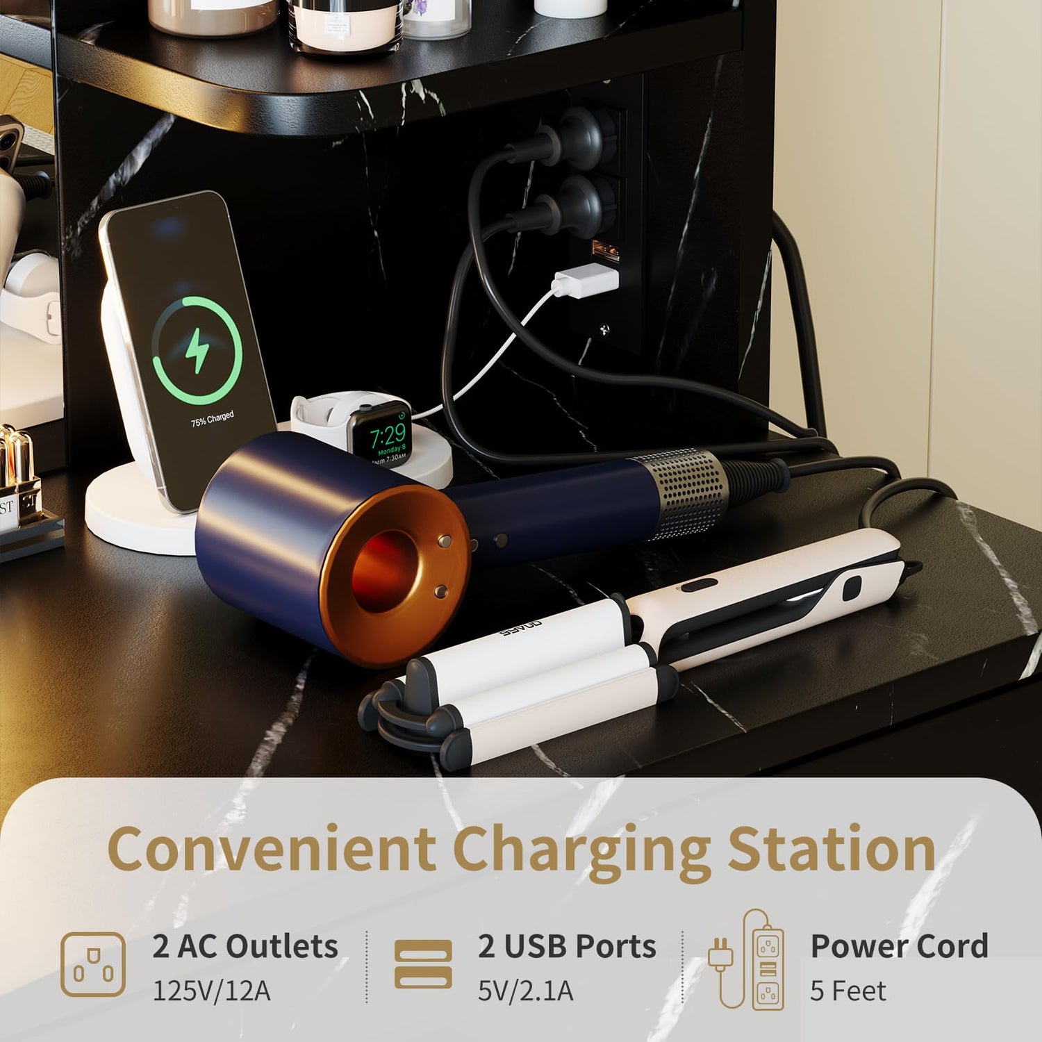 - 【Convenient Charging Station】quipped with 2 standard outlets and 2 USB ports, this makeup vanity desk with lights makes it easy to connect your hairdryer and curling iron, as well as charge your phone, tablet, or other devices. Get picture-perfect selfies after finishing your makeup with ease.
