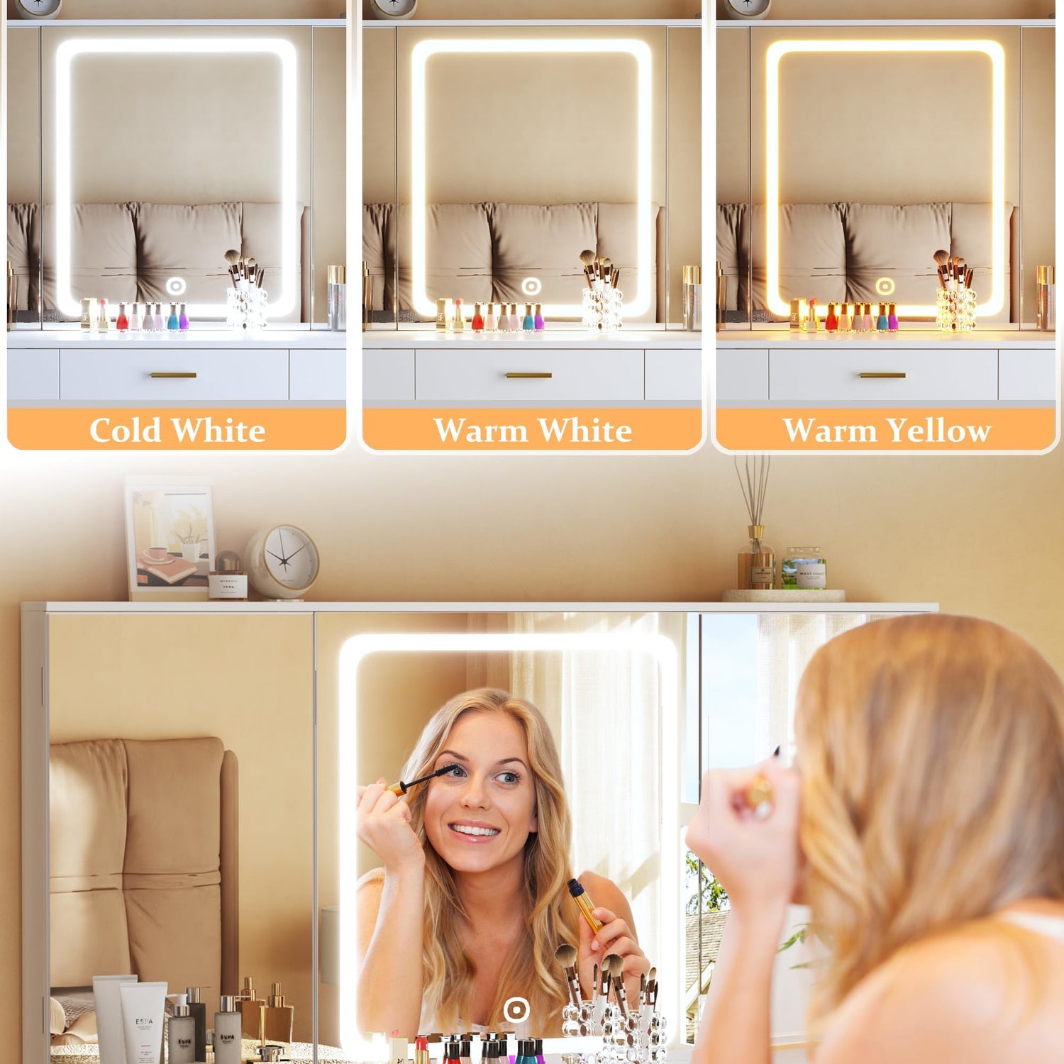 - Makeup Vanity with LED Large Mirror: Featured on the makeup vanity desk with lights are large mirror, measuring 47.2"W * 24.8"H, with 3 LED Lighting modes (the brightness is adjustable), the Large mirror can provide an ultra-comprehensive field of vision, showing all angles perfectly.