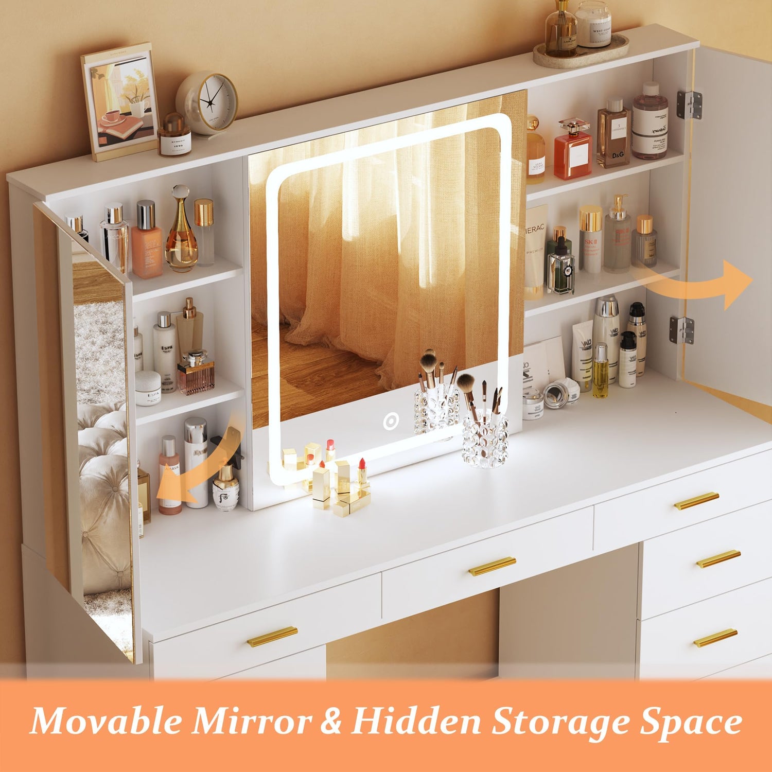 Vanity Desk with Mirror and Lights, 47.2" Makeup Vanity with 11 Storage Drawers and Hidden Storage Shelves, White Vanity with Charging Stations & 3 LED Lighting Modes Adjustable, for Bedroom