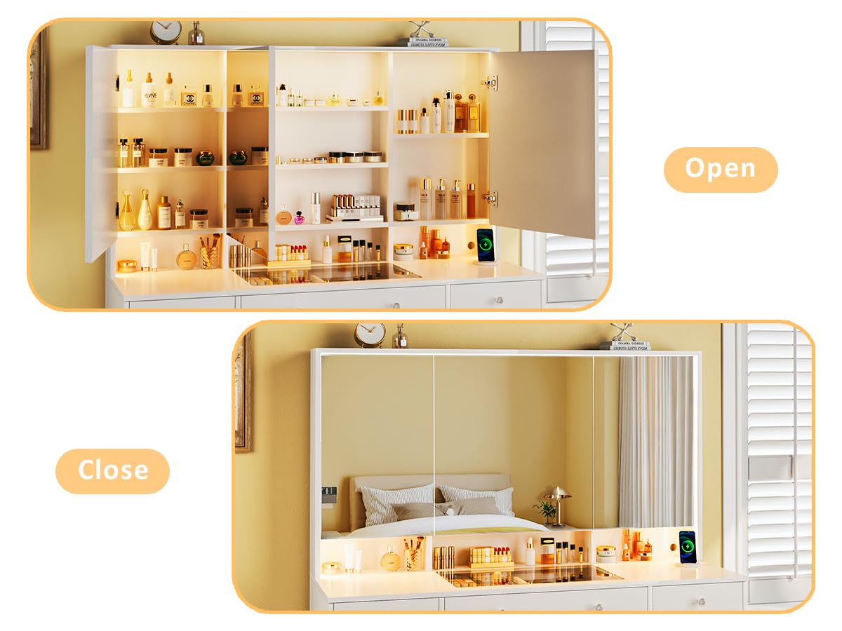 - White Vanity with Excellent Ample Storage: There are 11 wood drawers and 3 areas total of 8 hidden storage shelves behind the large mirror, over 19 storage areas to fit your needs. 11 drawers designed with 3 different sizes to help you sort different items. 8 hidden storage spaces behind the mirror also have different heights, even some tall & large skincare sets can be placed. The hidden storage provides a dust-free, light-blocking space, makes everything invisible, keeps everything organized!