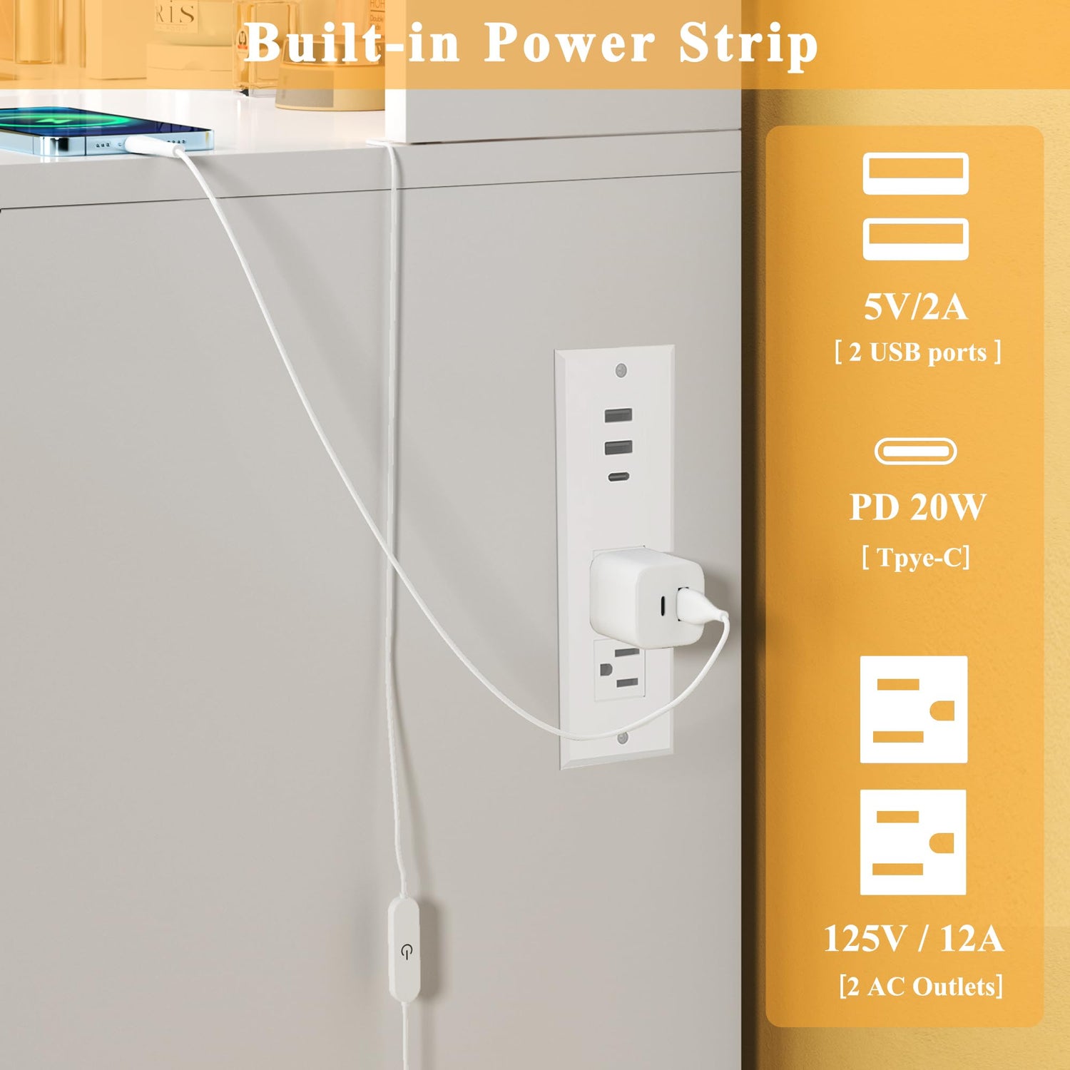 - Vanity Set with Charging Station: This glass top vanity set is equipped with 2 AC & 2 USB power outlets & 1 Type-C, making it easy to use hair dryers, curling irons or charge mobile devices at the same time and doesn't need to find another power outlet when you doing makeup.