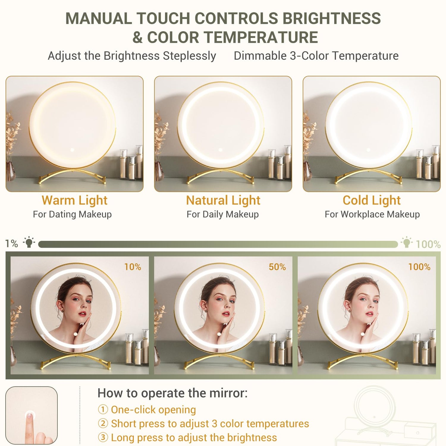 - Vanity Desk with Mirror & 3 Colors Lights: Our vanity makeup desk provide a round movable mirror with 3 different color settings: warm yellow, natural white and cold white light, soft and not dazzling light source, allowing you to make-up for a long time without hurting your eyes. You can click the button easy to change the color or adjust the brightness steplessly according to different scenes and different makeup. Bring yourself a joyful dressing experience with this makeup vanity.