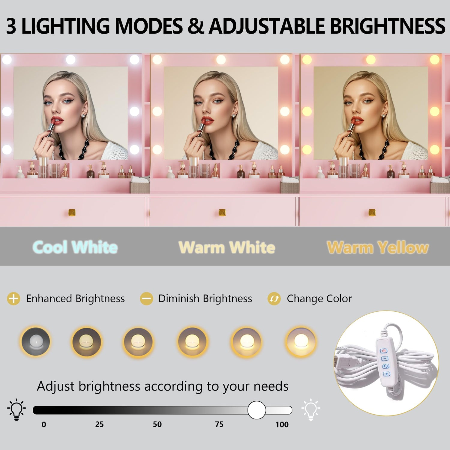 - 【3 Lighting Modes & Brightness Adjustable】The vanity desk is equipped with a mirror. Surrounding the mirror, there are 7 Hollywood bulbs, providing 3 lighting modes: warm yellow, natural light and bright white, the brightness is adjustable according to your different makeup needs, perfect for home makeup, salon, and live broadcast. So you can experience the star-like makeup treatment