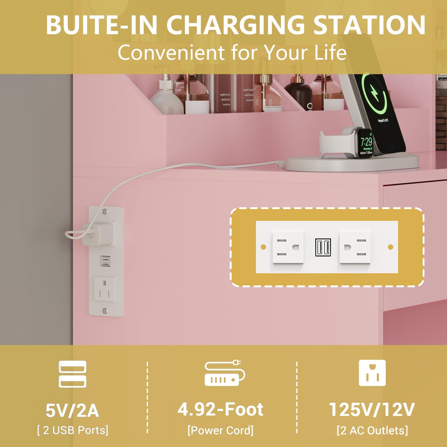 - 【Convenient Charging Station】The vanity mirror with lights desk and chair is equipped with a built-in charging station, including 2 AC outlets and 2 USB ports, allowing you to sit at your makeup vanity and use your hair dryer or curling iron within easy reach and charge your phone, tablet, or other electronics