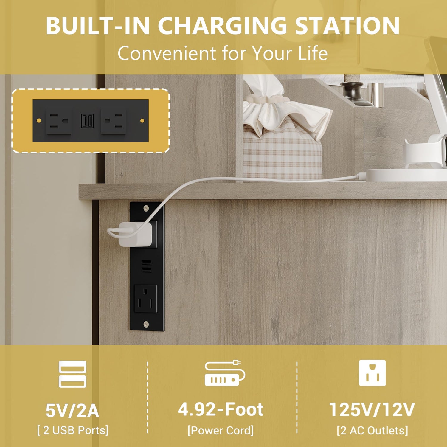- 【Built-in Charging Station】The vanity is equipped with a built-in charging station, including 2 AC outlets and 2 USB ports, through which you can charge and use electronic devices at the same time