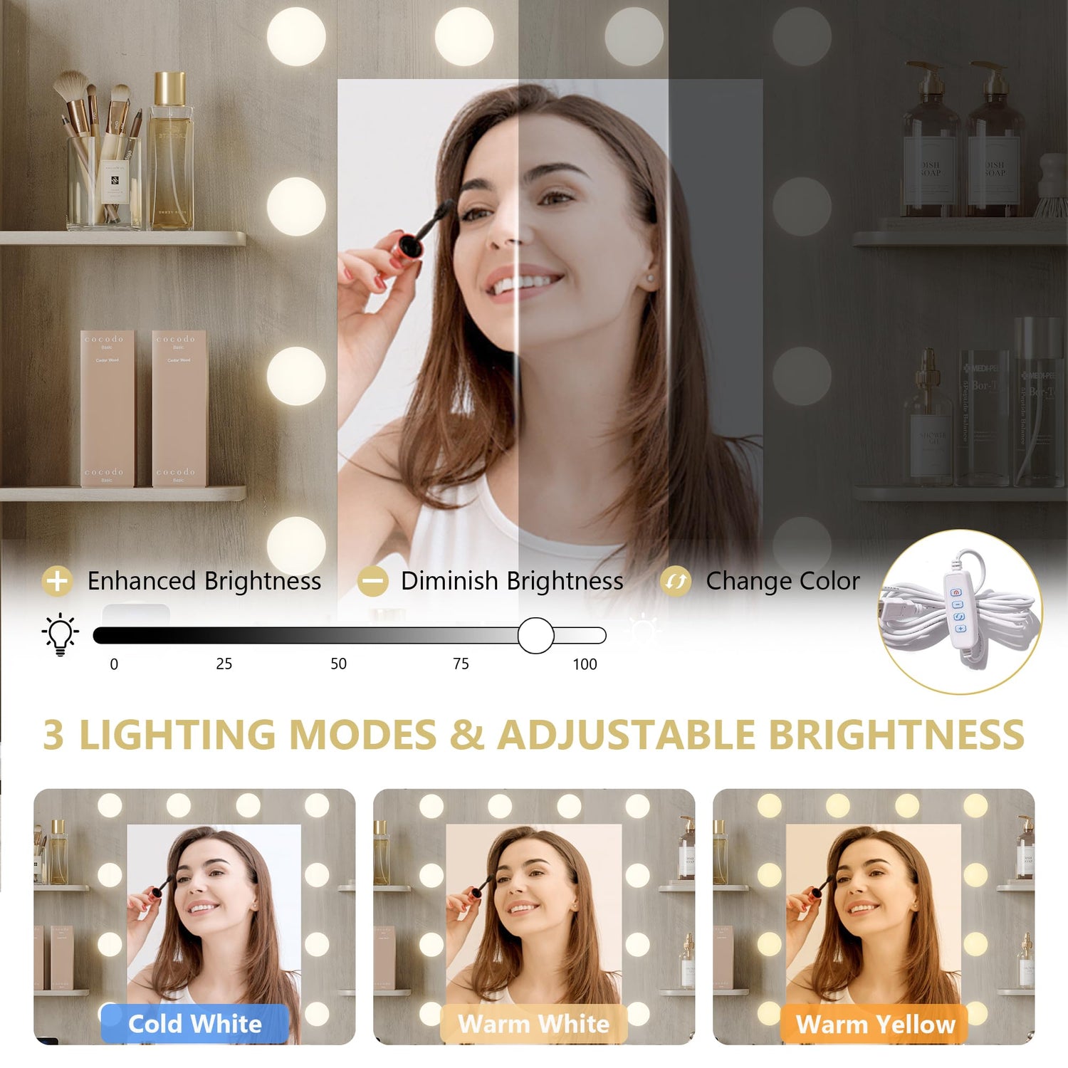 - 【3 Color Lighting Modes】The vanity desk is equipped with a big mirror. Surrounding the mirror, there are 10 Hollywood bulbs, providing 3 color modes (warm/natural/cool) and brightness adjustable, this makeup vanity can meet all your different needs, perfect for home makeup, salon, and live broadcast. So you can experience the star-like makeup treatment