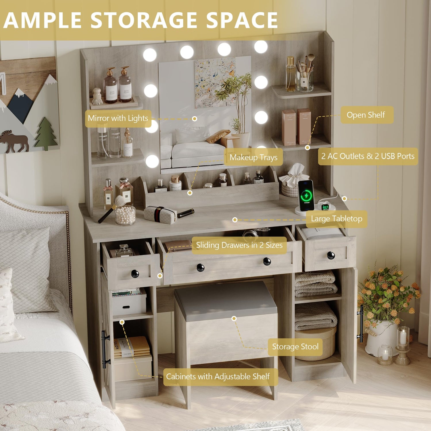 Vanity Makeup Desk with Mirror and Lights, Farmhouse Vanity Table Set with Storage Drawers, Charging Station & Chair, 43" Large Rustic Dressing Table, 3 Lighting Modes for Women Girls Bedroom, Grey