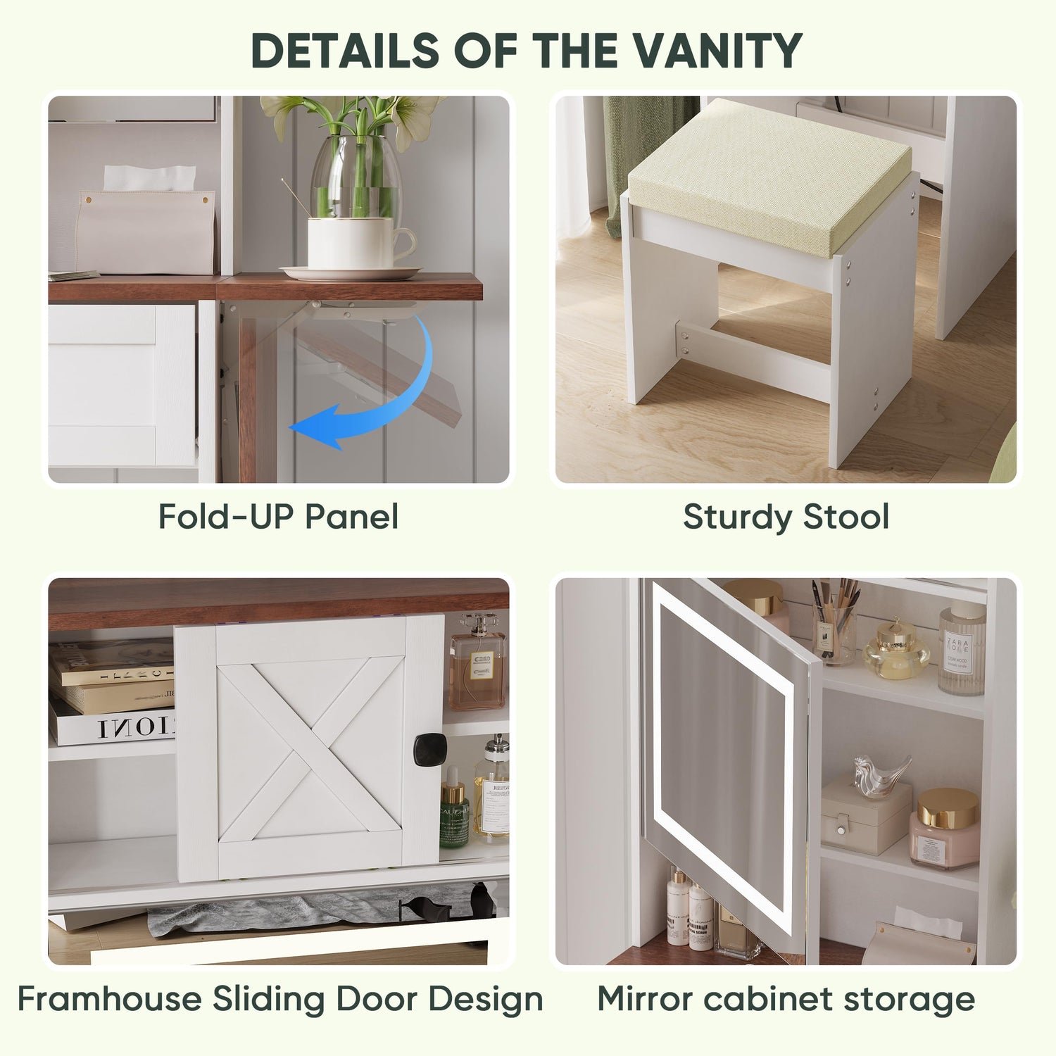 Vanity, Small Vanity Desk with Mirror and Lights, Farmhouse Makeup Vanity Table with 3 Adjustable Lighted Mirror and Chair for Compact Space, Corner Mini White Make up Table with Fold-up Panel