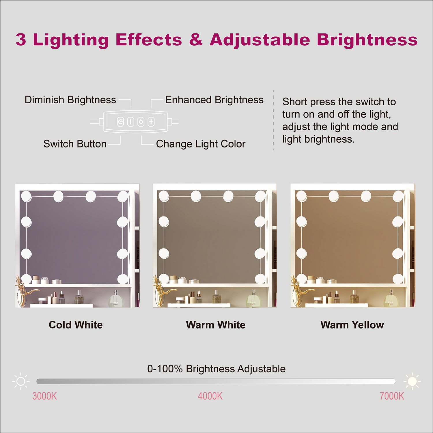 - Illuminated Mirror with Hollywood Lights: The vanity table comes with a large mirror and ten Hollywood-style light bulbs. The mirror provides ample reflection space, and the included light bulbs offer three lighting modes: warm white, natural light, and cool white. Each lighting mode is adjustable in terms of brightness, allowing you to create the perfect lighting environment for your makeup application