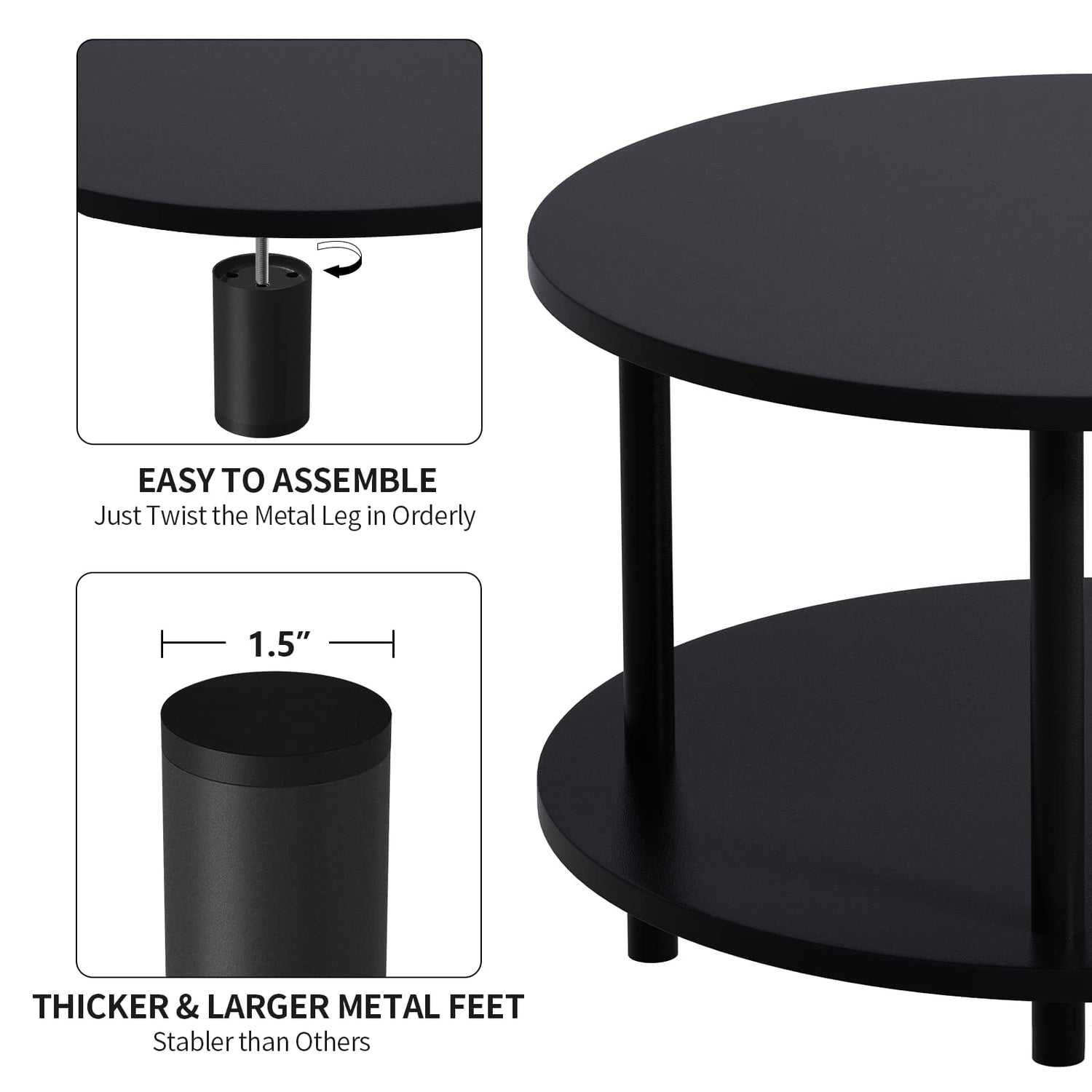 - STURDY AND STABLE: Made of high quality MDF board and durable metal table leg. The round table leg (diameter: 1.5’’) is thicker and lager so this circular coffee table will be enough durable and stable to support stuff on the table (Loading Capacity: 220lbs). The leg bottom is polished plastic, so no worries about damage to the floor and blanket.