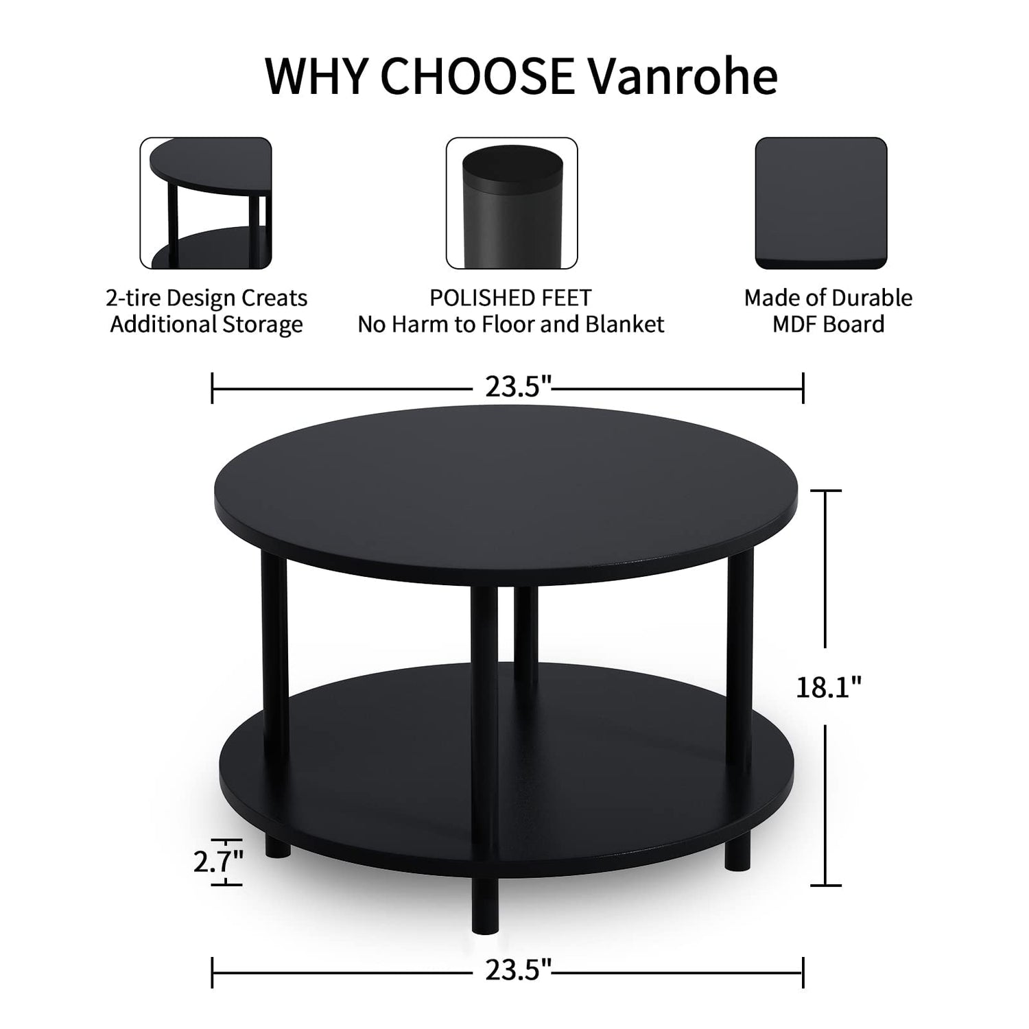- CLASSIC BLACK COFFEE TABLE: With black wood finish and black iron legs, Vanrohe small circular coffee table can match well different style furniture and room. If you don't know how to choose a color, black is always right.You can put it in your living room, office, and reception room as a coffee table, couch table or large end table.