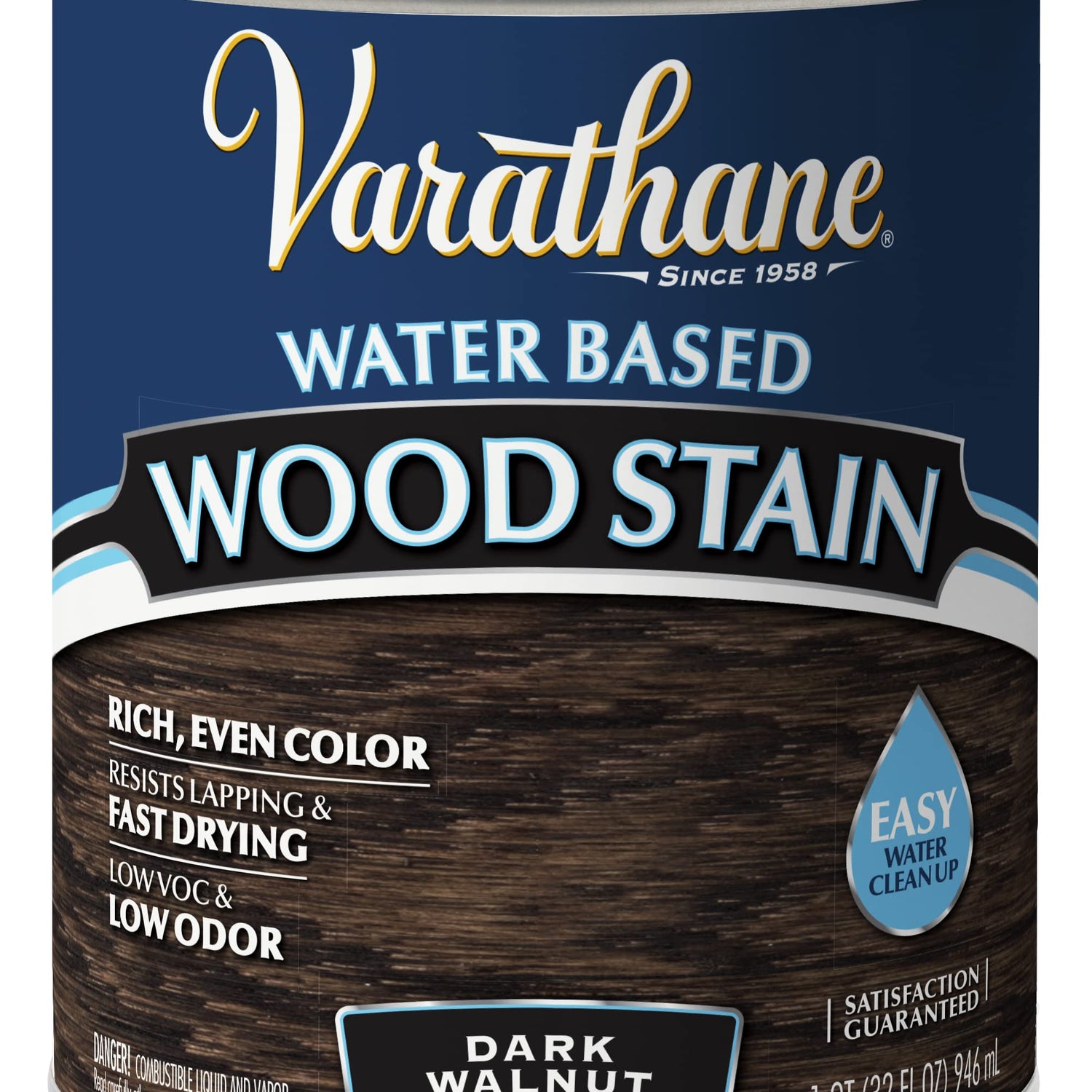 Varathane Water Based Dark Walnut Wood Stain is a beautiful dark brown wood stain that enhances the natural look of wood with its innovative advanced pigment formula, adding rich color to otherwise plain wood. This water base Varathane stain only requires 1 coat for exceptional coverage on furniture, cabinets, wood floor, trim and more. For best results, be sure to apply Varathane Water Based Pre-Stain Wood Conditioner before use. This fast drying, low odor and low VOC wood stain has low odor and cleans up easily with soap and water.