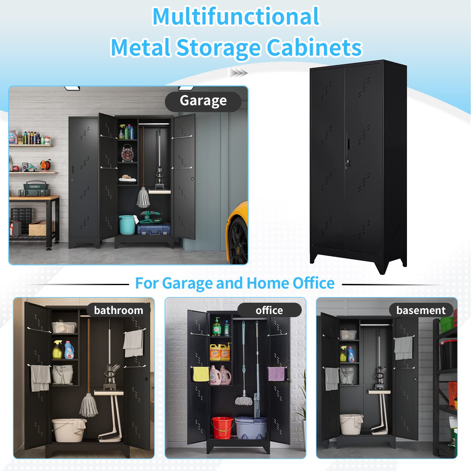VASAAOSD 75" Metal Storage Cabinet, Tool Cabinet with Hooks, Garage Storage Cabinet with Lock, Heavy-Duty Tool Storage Cabinet for Utility Room, Gym, Basement, Broom Closet Cabinet, Black