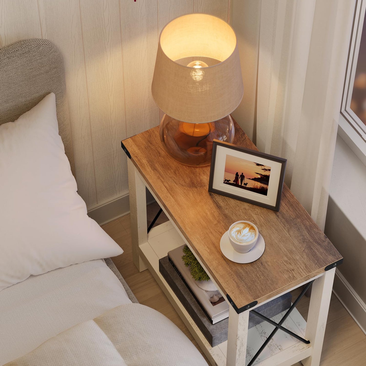 - 【FARMHOUSE CHARM】This end table features rustic white and honey brown panels, complemented by metal X-bars and corner accents, adding a cozy and inviting farmhouse vibe to your living space