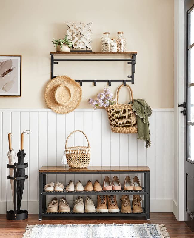 VASAGLE, 3-Tier Shoe Rack, Shelf Storage Bench with Metal Mesh Shelves and Seat, Free Standing Shoe Organizer for Entryway, 11.8 x 39.4 x 17.7 Inches, Rustic Brown and Black ULBS078B01
