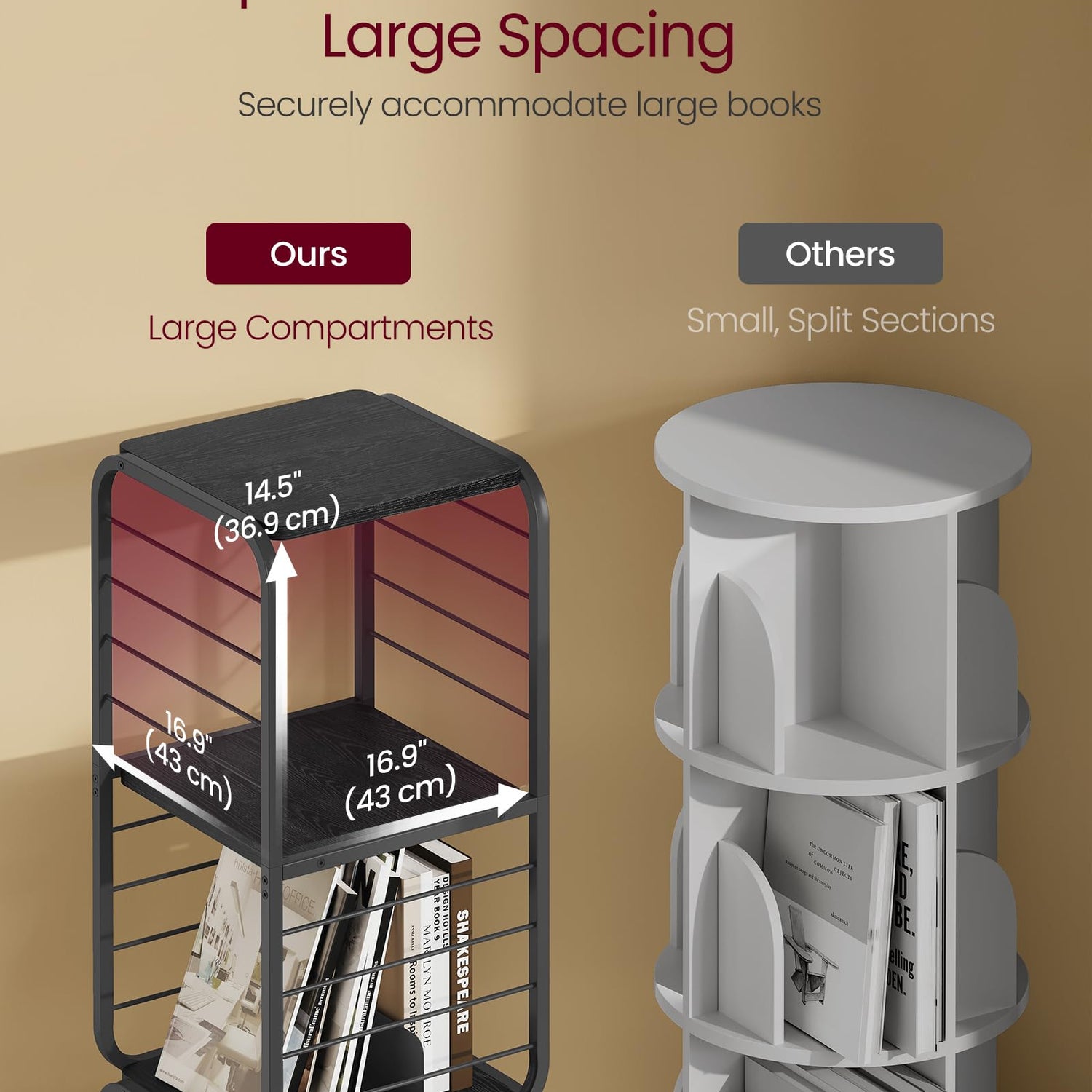 The standout feature of this bookshelf is its unique 360° rotating design, allowing you to easily access your favourite books with just a spin. With side wire guards, you can rest assured that your items will stay securely in place during rotation, while the spacious shelves are expertly crafted to accommodate larger books, ensuring your collection is displayed beautifully.