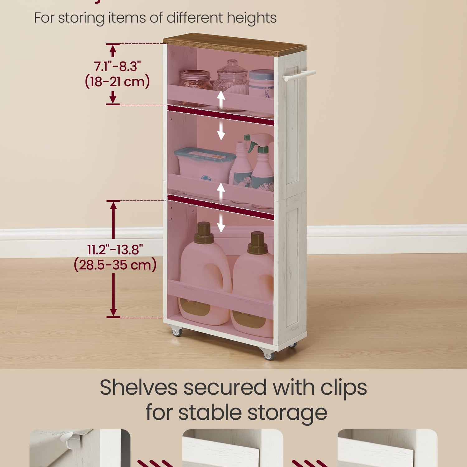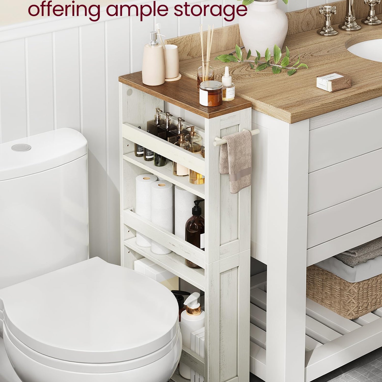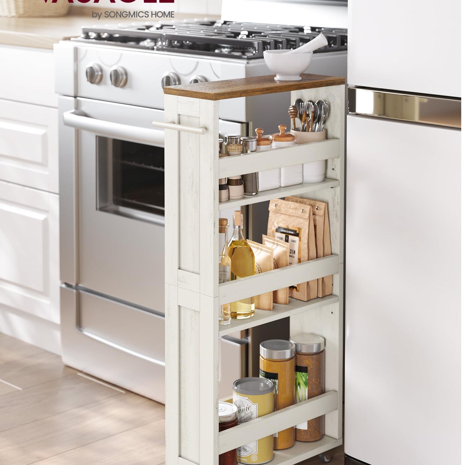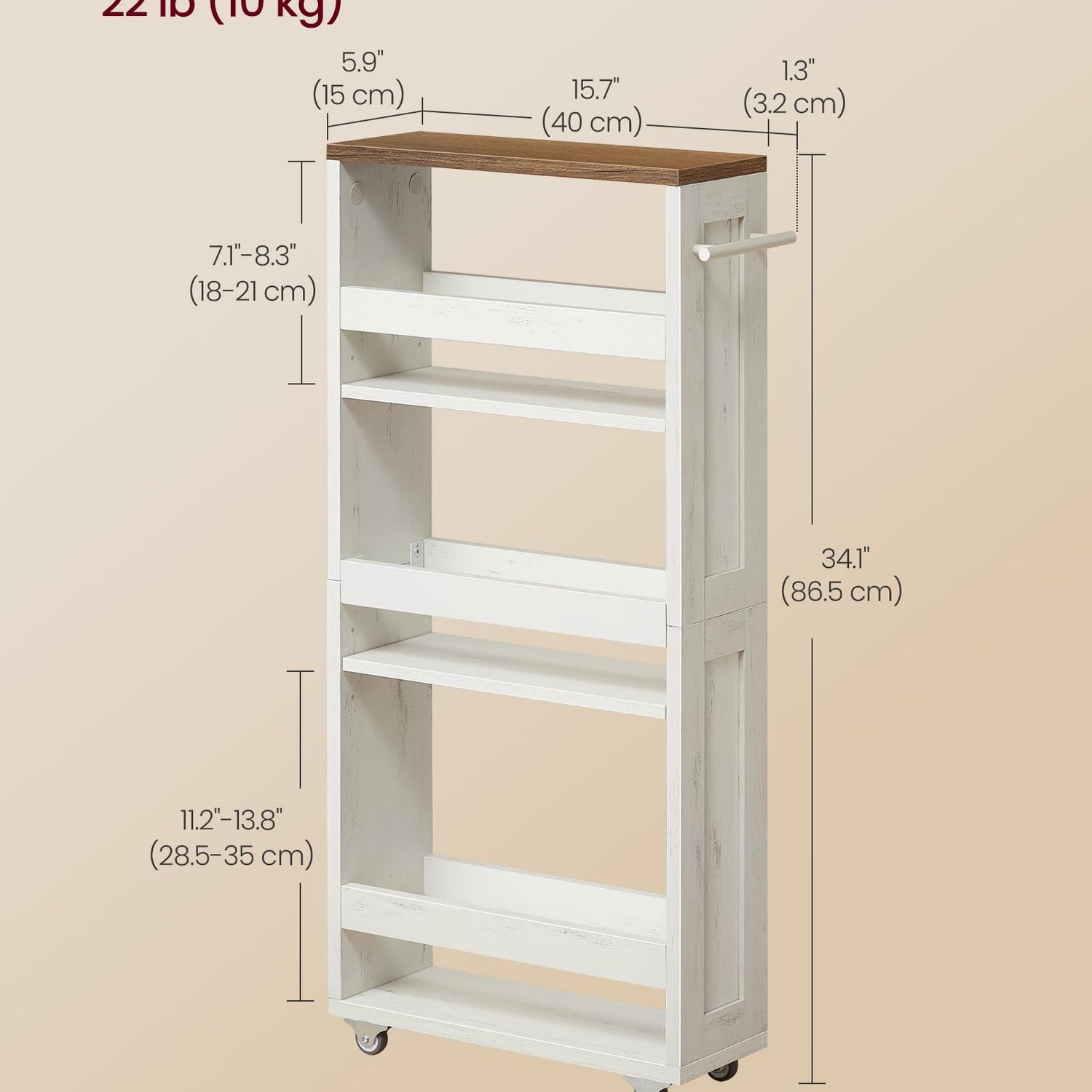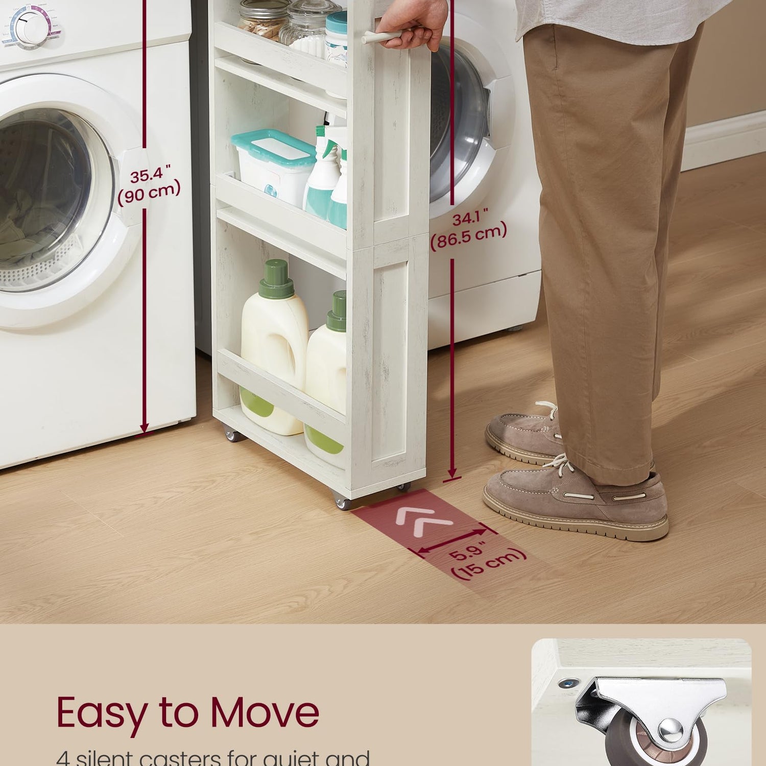 VASAGLE 4-Tier Slide-Out Storage Cart, Slim Kitchen Cart for Small Spaces, with Wheels, Handle, Bathroom, Laundry Room, 5.9 x 17 x 34.1 Inches, Rustic White and Honey Brown ULRC050K01