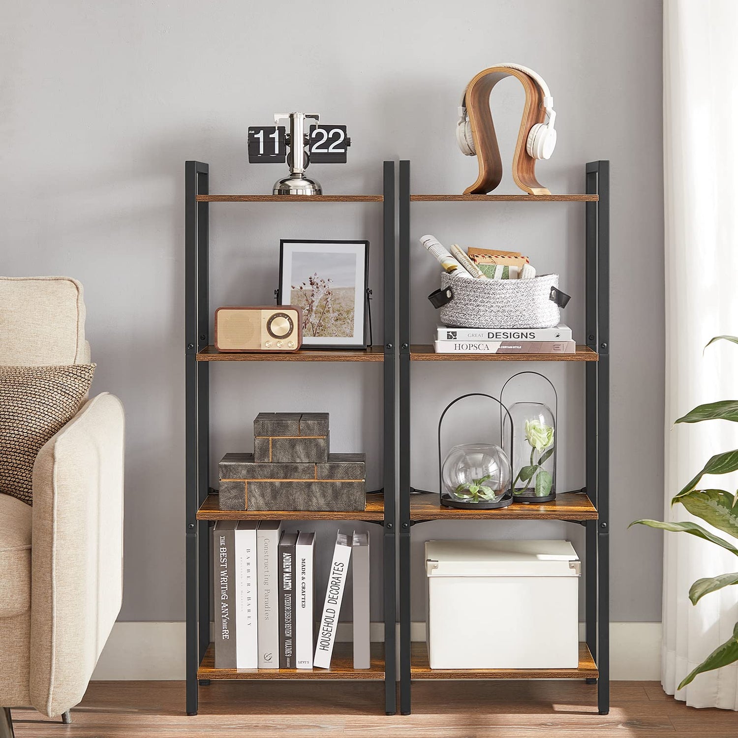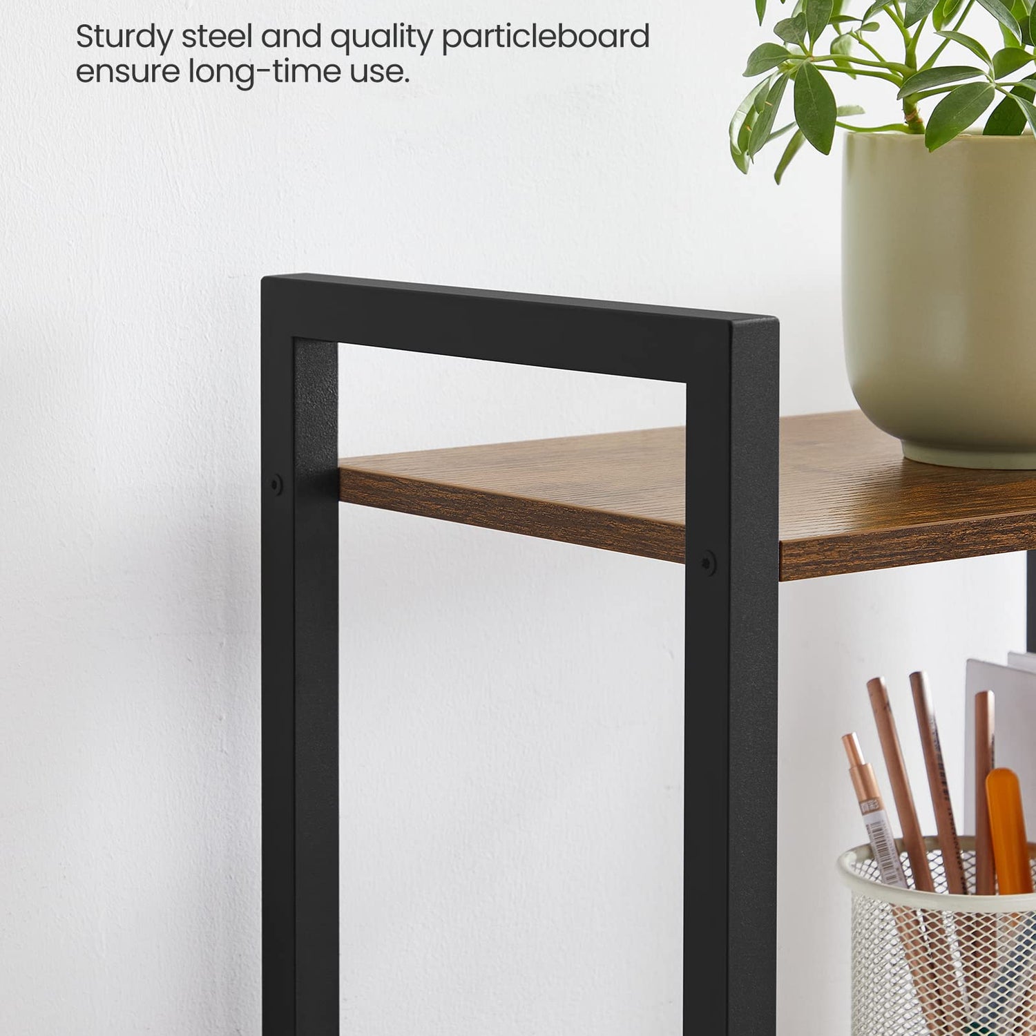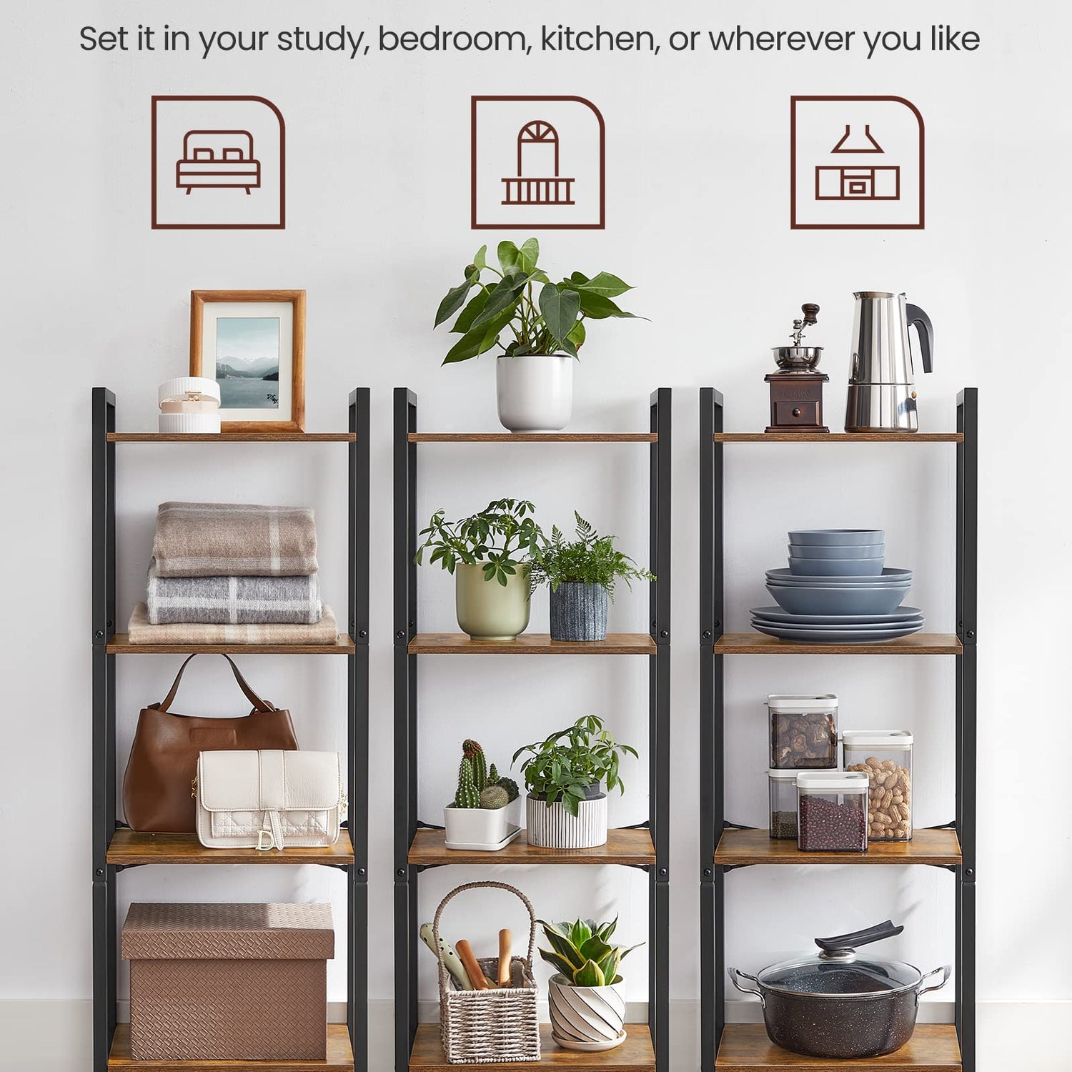 - [Embrace an Industrial Vibe] The rustic brown shelves paired with a black steel frame create a stylish industrial look, allowing this freestanding shelf to fit seamlessly in with your home decor and give your space an instant update