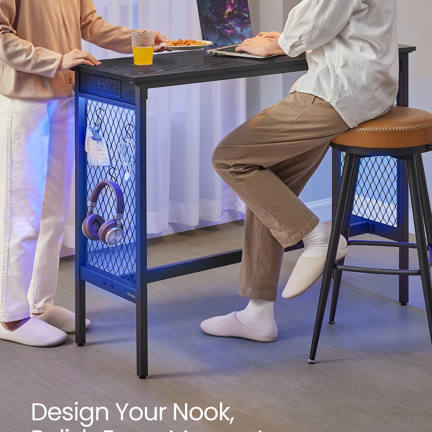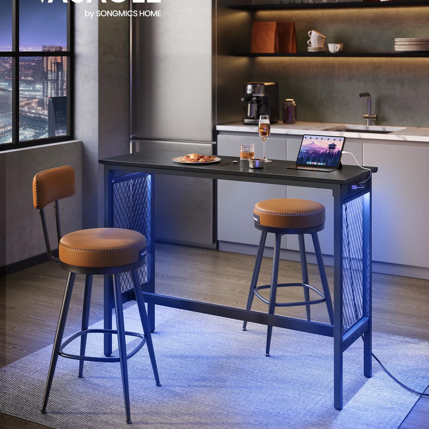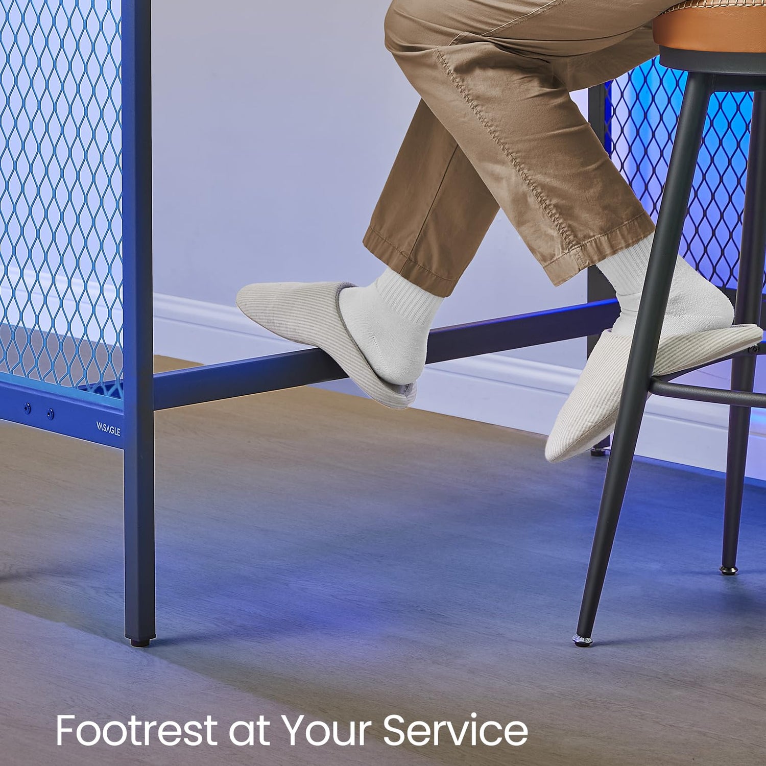 VASAGLE 47.2" Long Bar Table with Charging Station, LED Lights, Narrow Counter Tables Rectangular Couch Sofa Table, Metal Mesh Panels Frame, High Top Pub Table for Kitchen Living Room Party, Black