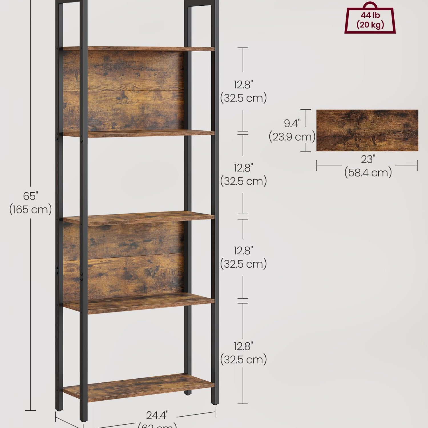 - [Stay Organized in Style] Elevate your space with this 9.4"D x 24.4"W x 65"H industrial bookshelf. It offers 5 large, warm-toned storage shelves to organize your books and decorations, all while adding aesthetic appeal to your home decor