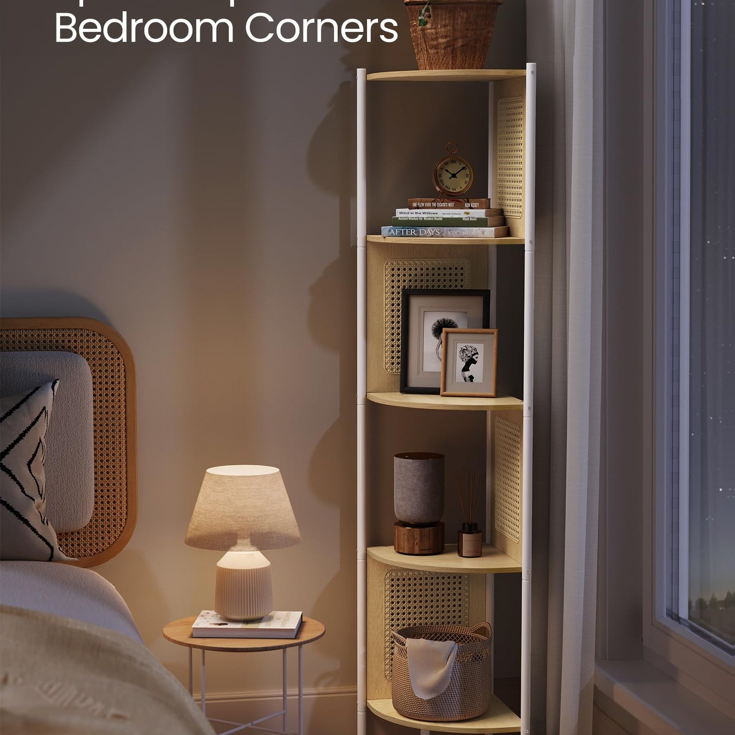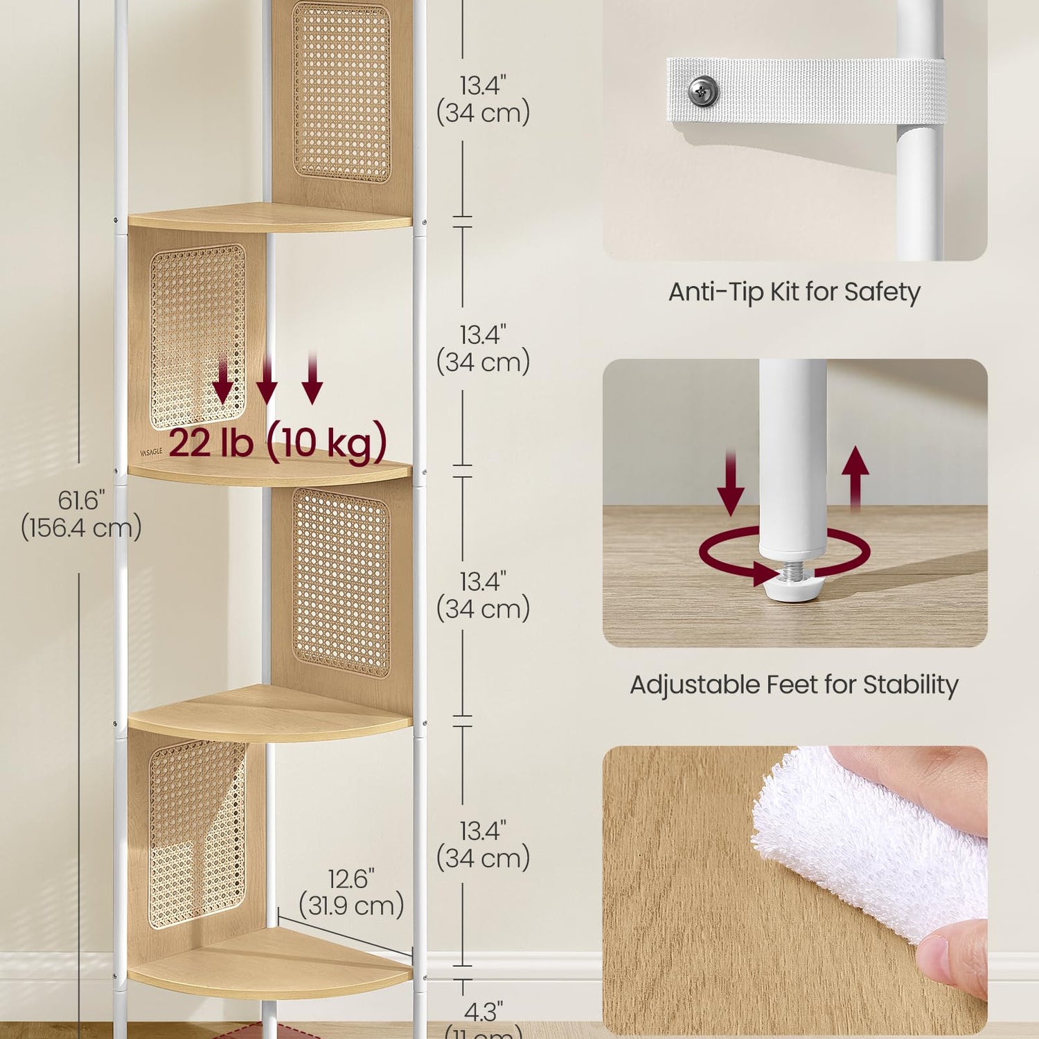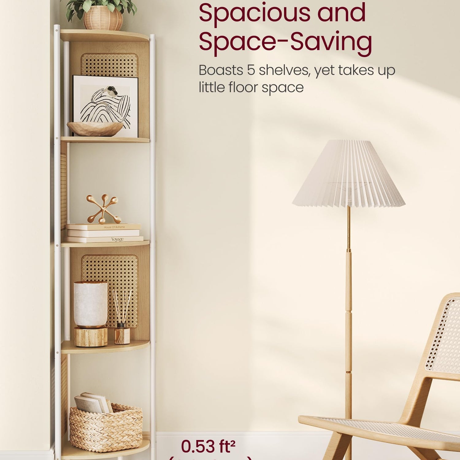 - [Spacious and Space-Saving] Measuring 12.6”D x 12.6”W x 61.6”H, this corner shelf offers five shelves for your books, photo frames, plants, and ornaments. Its compact shape optimizes unused corners without occupying too much floor space