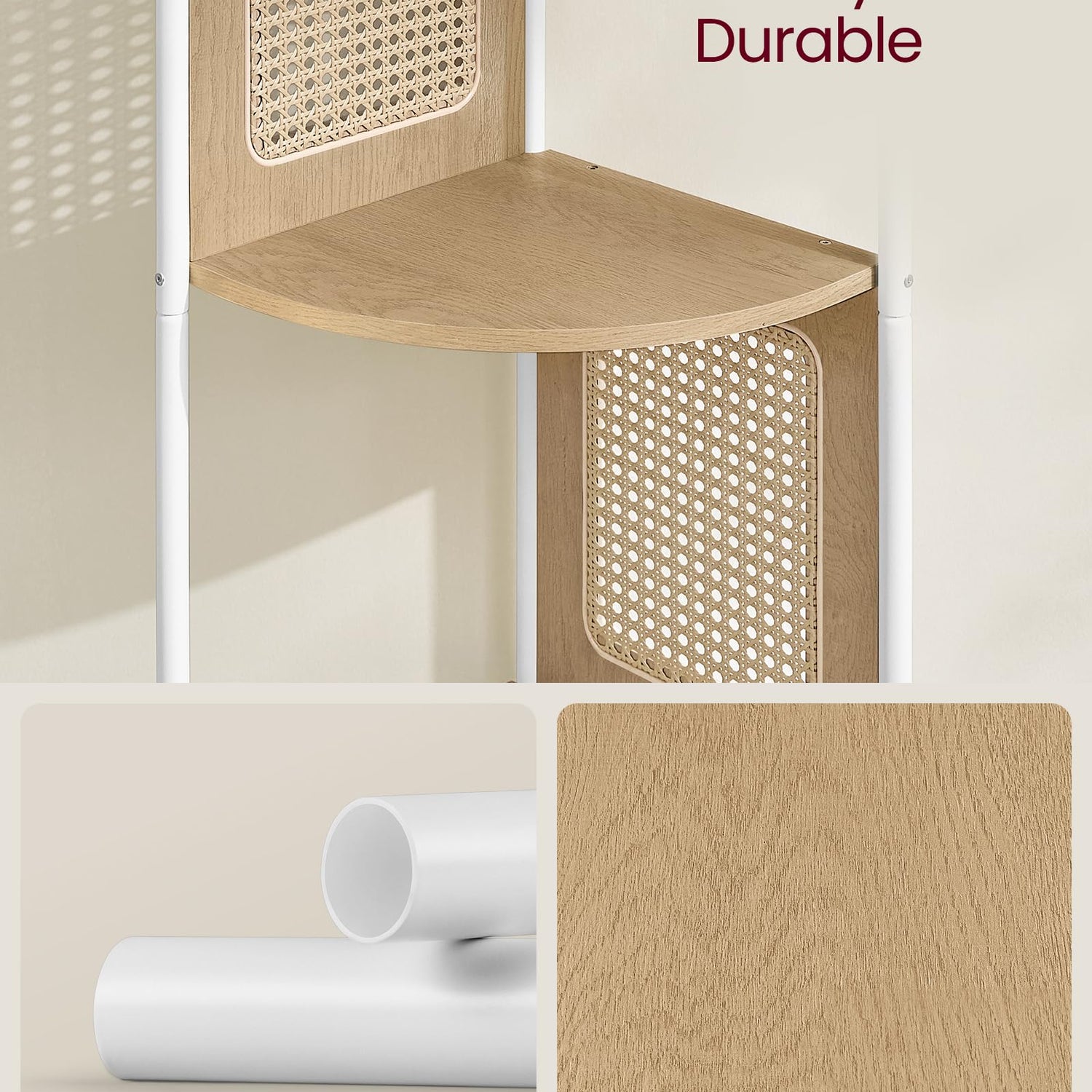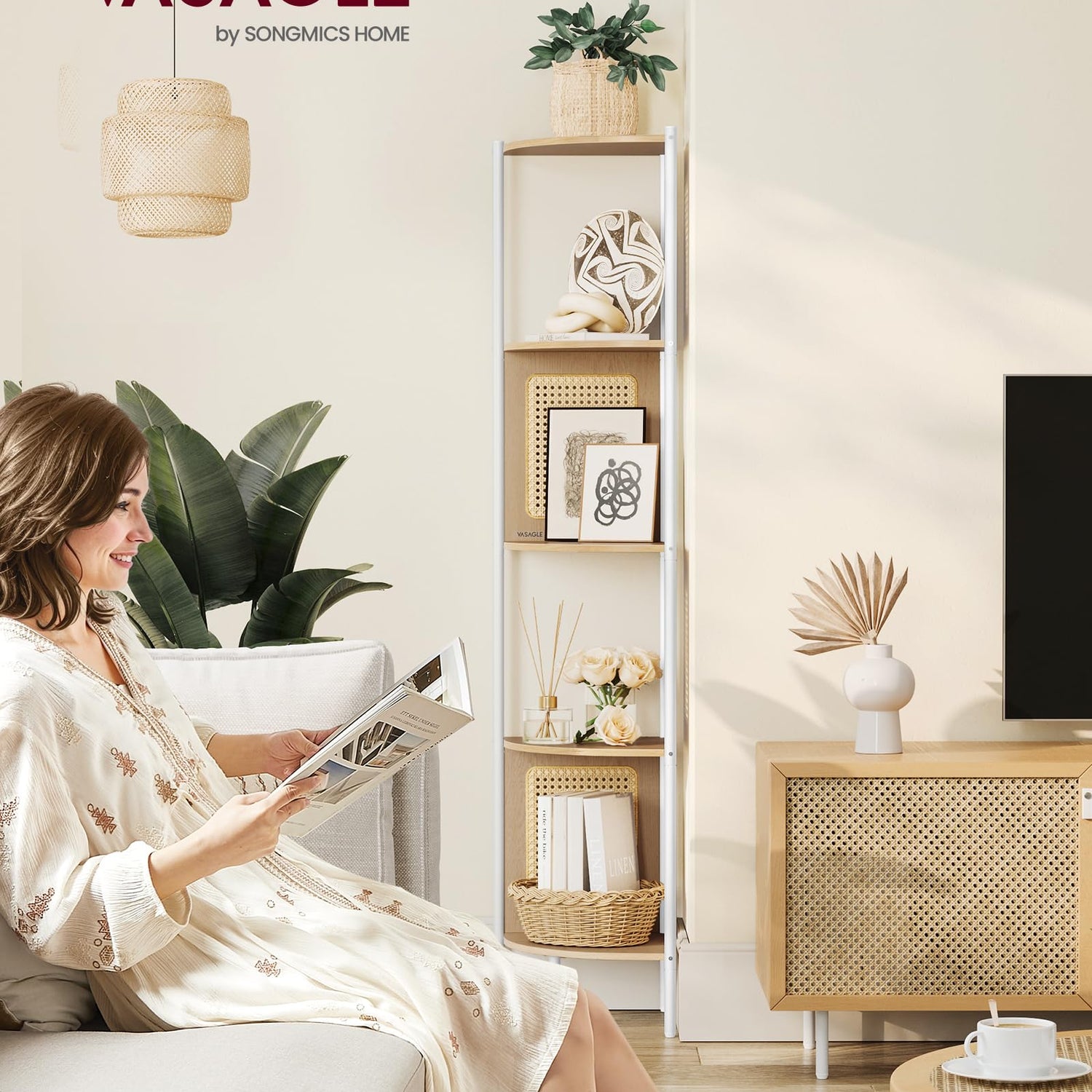 VASAGLE 5-Tier Corner Shelf Stand, Boho Corner Bookshelf with Polyrattan Sides, Plant Stand for Living Room Bedroom Study Kitchen, Oak Beige ULLS588Y57