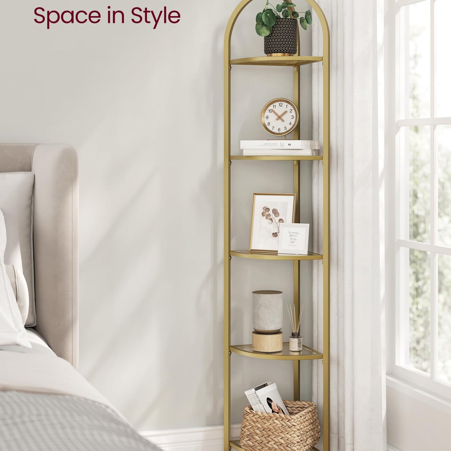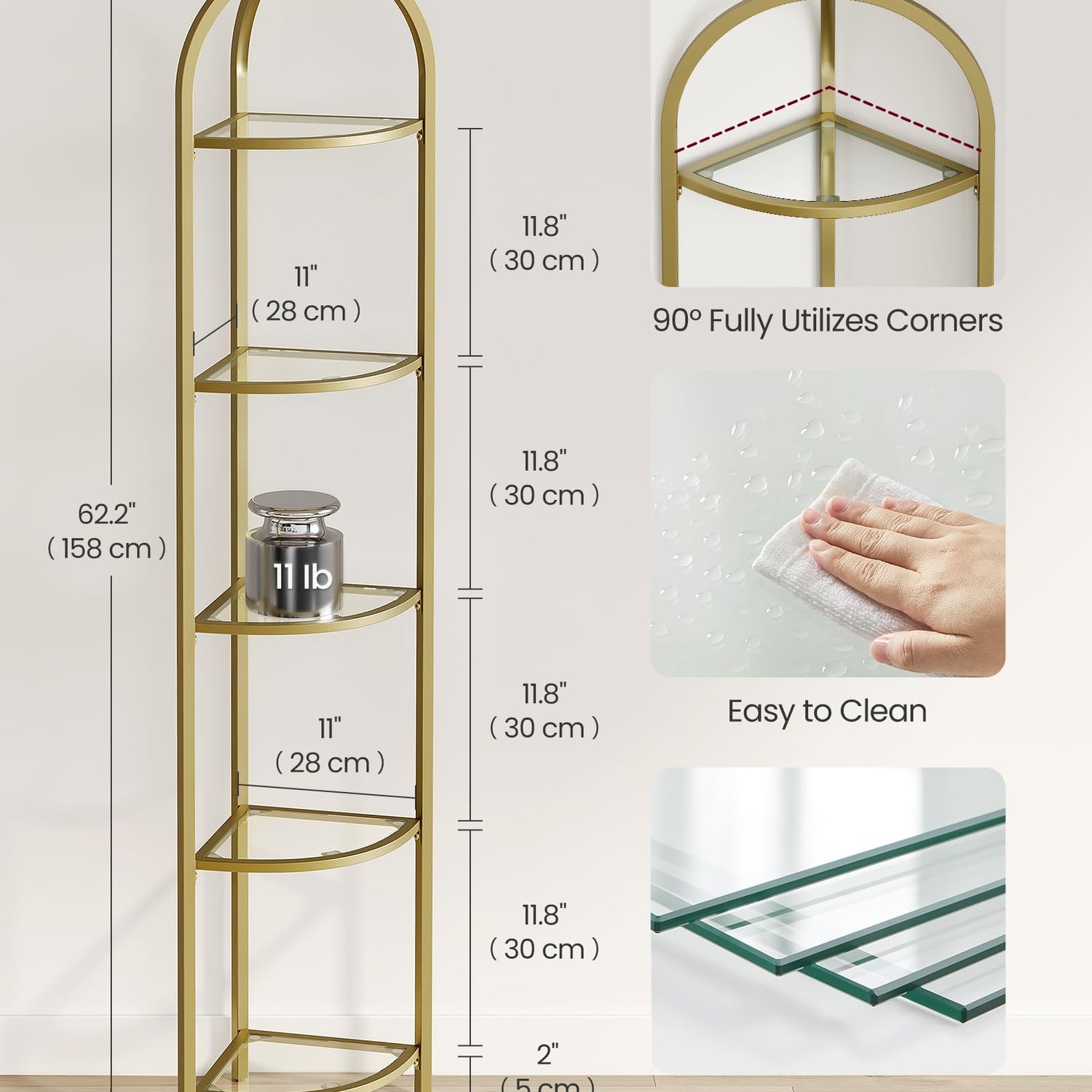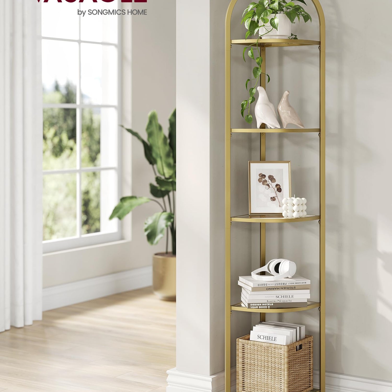VASAGLE 5-Tier Corner Shelf Stand, Corner Bookshelf, Bathroom Organizer, Plant Stand, Tempered Glass, Steel Frame, Modern Style, for Living Room, Bathroom, Kitchen, Metallic Gold ULGT810A01
