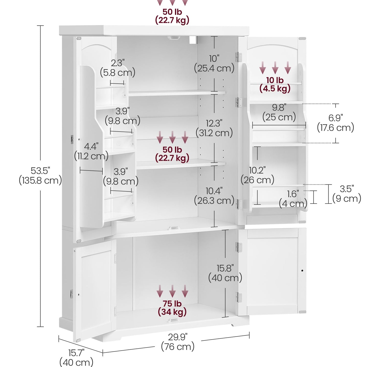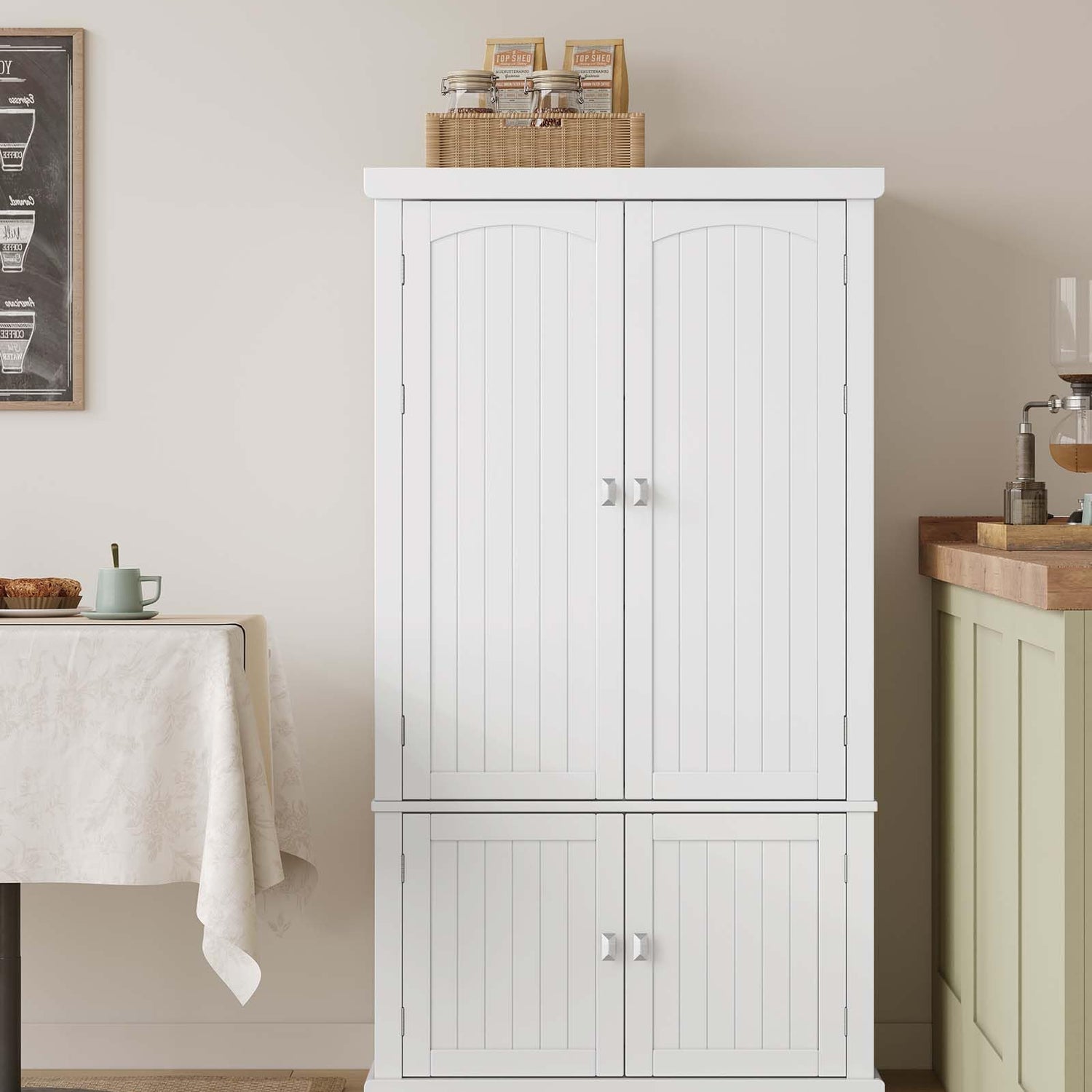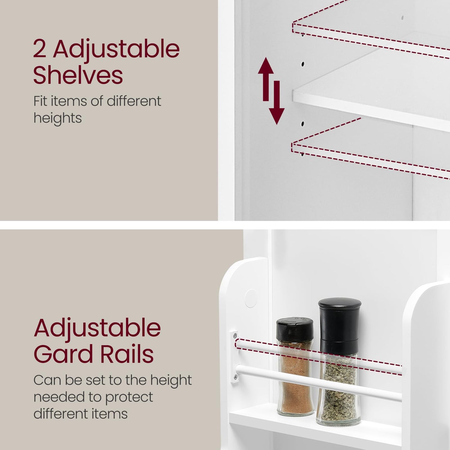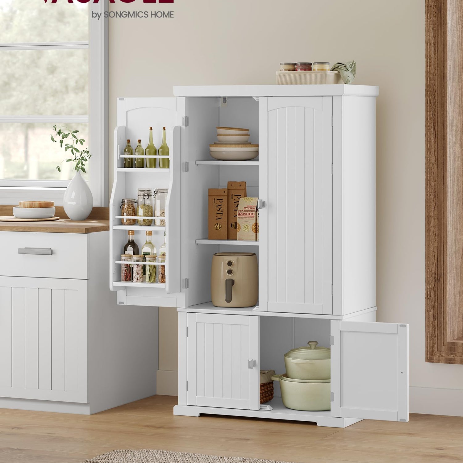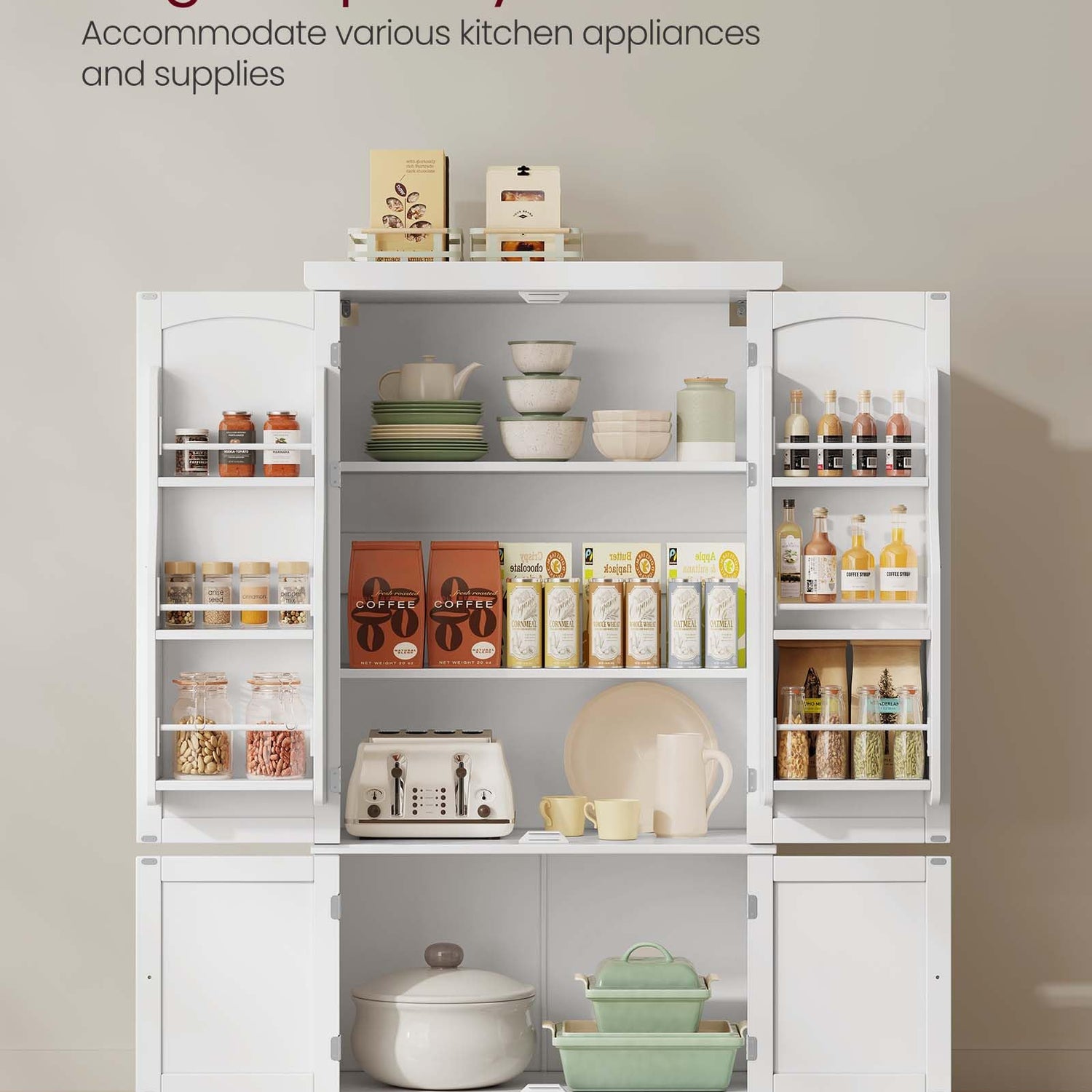 - [Adjustable Shelves] You can customize the storage space in the top cabinet of this kitchen pantry to accommodate items of varying sizes, thanks to the 2 adjustable shelves, each capable of being positioned at 5 different heights