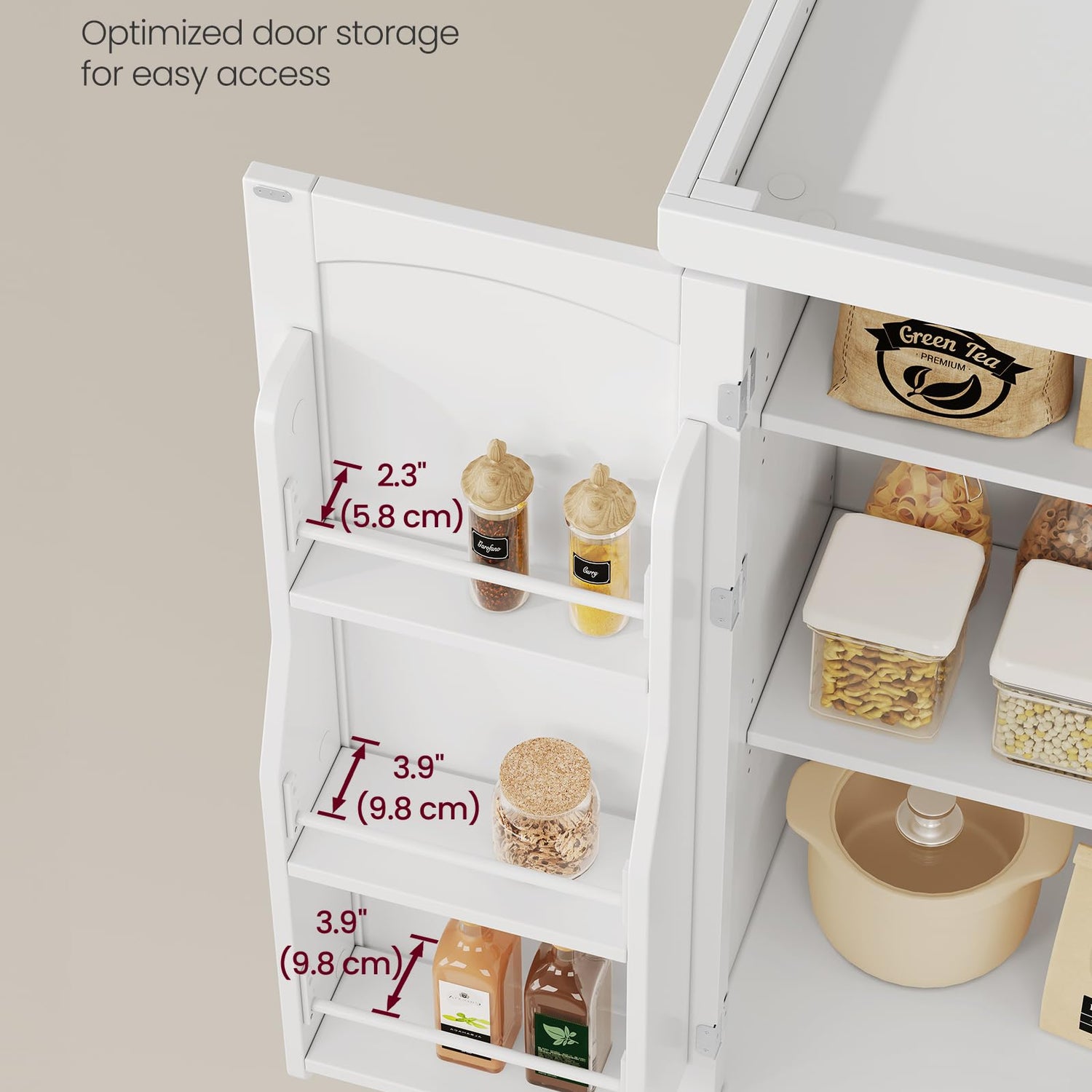- [Handy Door Shelves] Keep everything safe, easy to find, and easy to reach with this pantry cabinet. Its 6 door shelves, each with an adjustable guard rail, max out the space inside the top cabinet and prevent your tall and short items from falling off