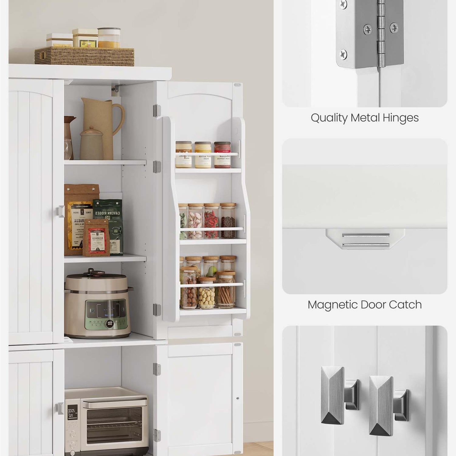 - [Stable, Durable, and Safe] Quality MDF, 3 hinges to support each top cabinet door—this pantry cabinet is sturdy and durable for long-term use; the included anti-tip kit helps secure the cabinet to the wall to give you a safer living space