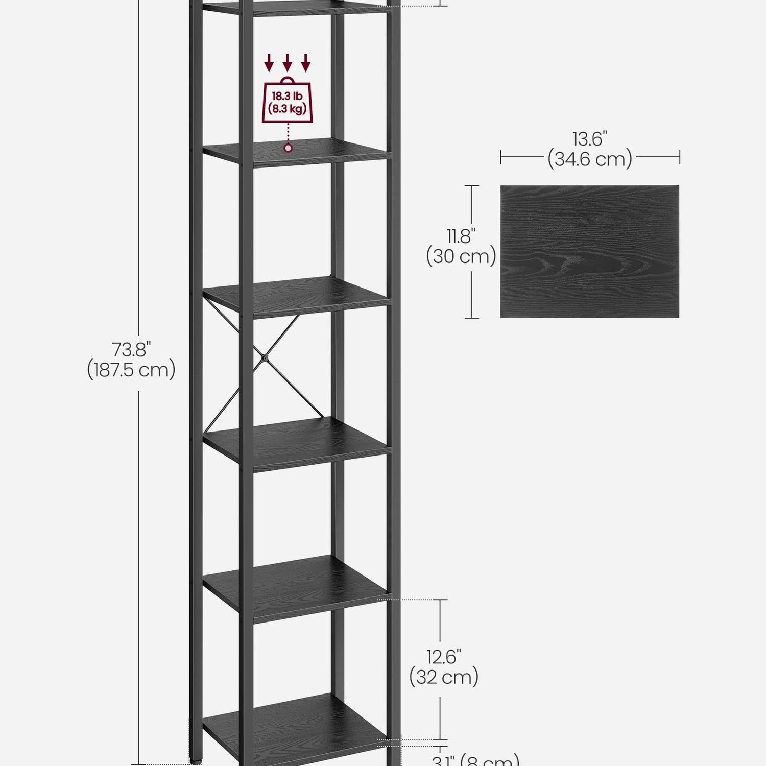 - [Space-Saving for Any Room] This 11.8"D x 15.7"W x 73.8"H narrow bookshelf occupies little floor space yet offers you 6 tiers of vertical storage, making full use of the small spaces in your living room, bedroom, bathroom, or entryway