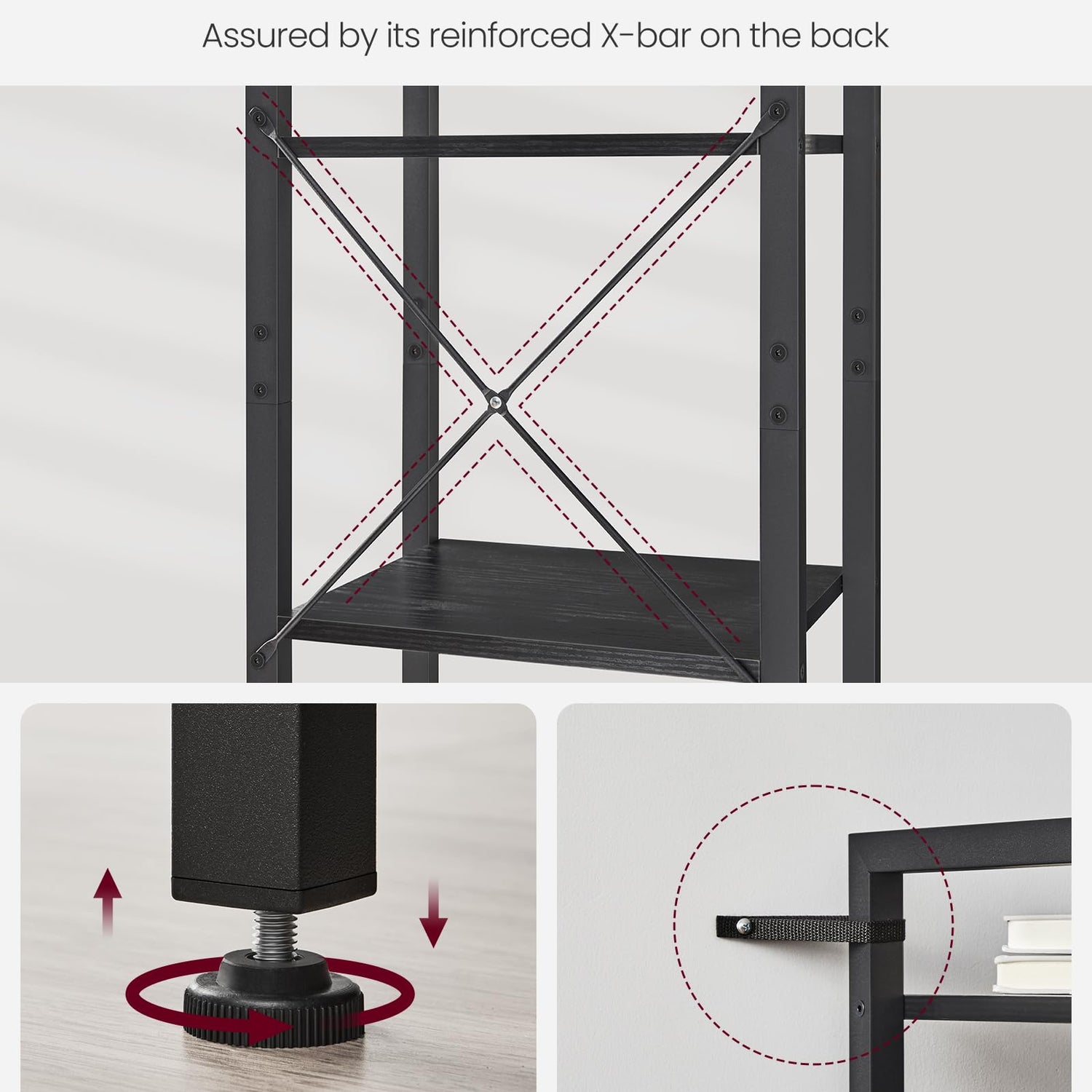 - [Stable and Safe] X-shaped bars reinforce the structure, adjustable feet keep this tall book shelf balanced on slightly uneven floors, and the included anti-tip kit will help you fix it to the wall for greater stability and safety